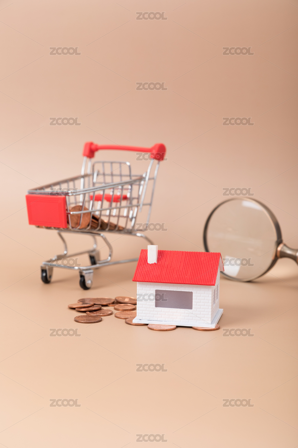 房屋模型旁放着放大镜和购物车