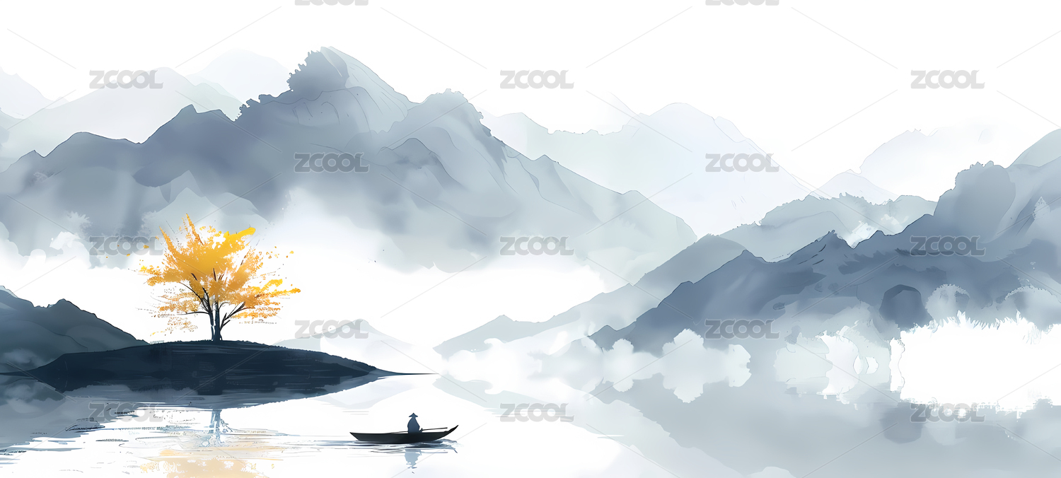 中国风,水墨,山水,古风,禅意,江南,淡雅,渔船,湖泊,烟雾