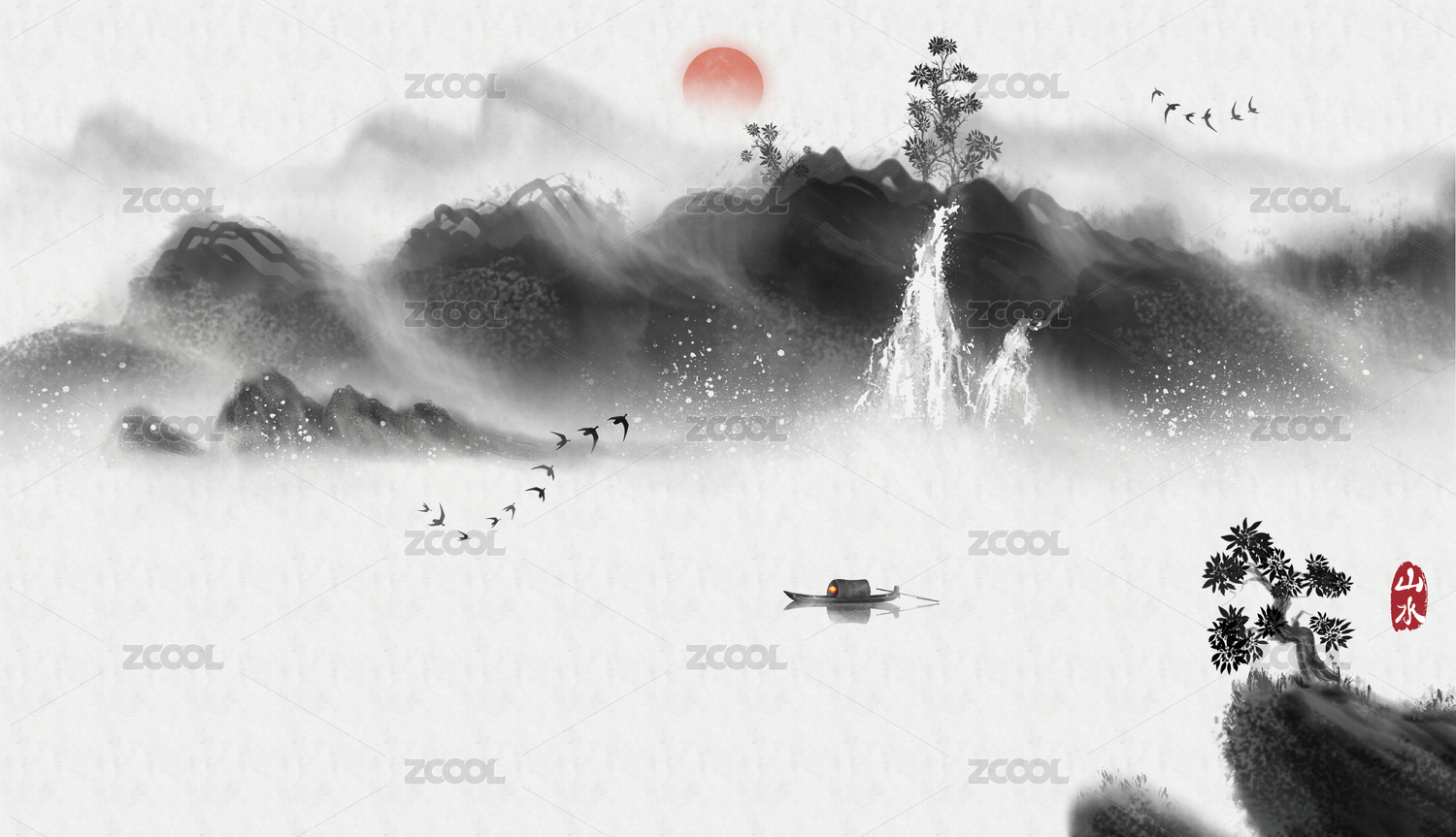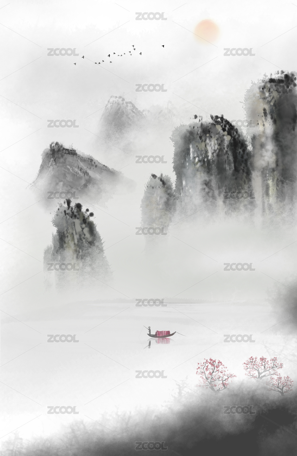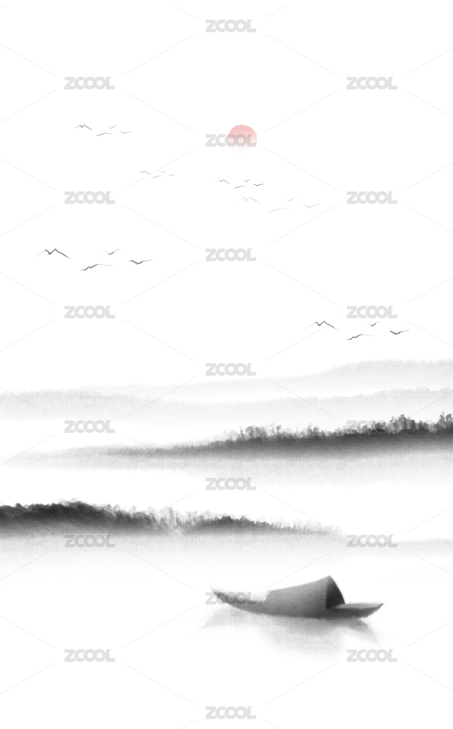 中国风,水墨,山水,意境,写意,背景,抽象,绘画,太阳,渔船