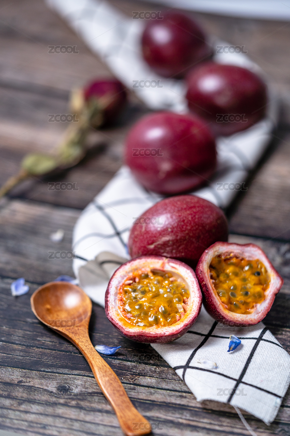 白方格子布上放着一盘百香果和百香果果肉