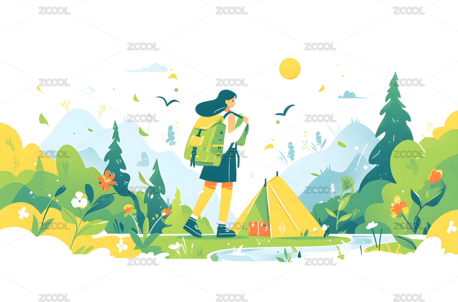 女孩徒步露营扁平插画