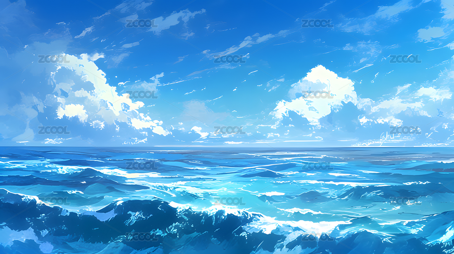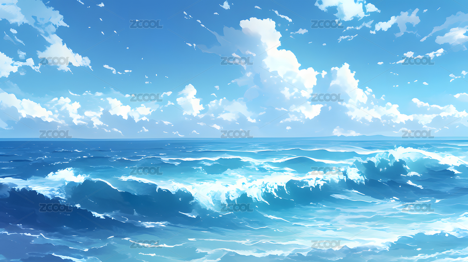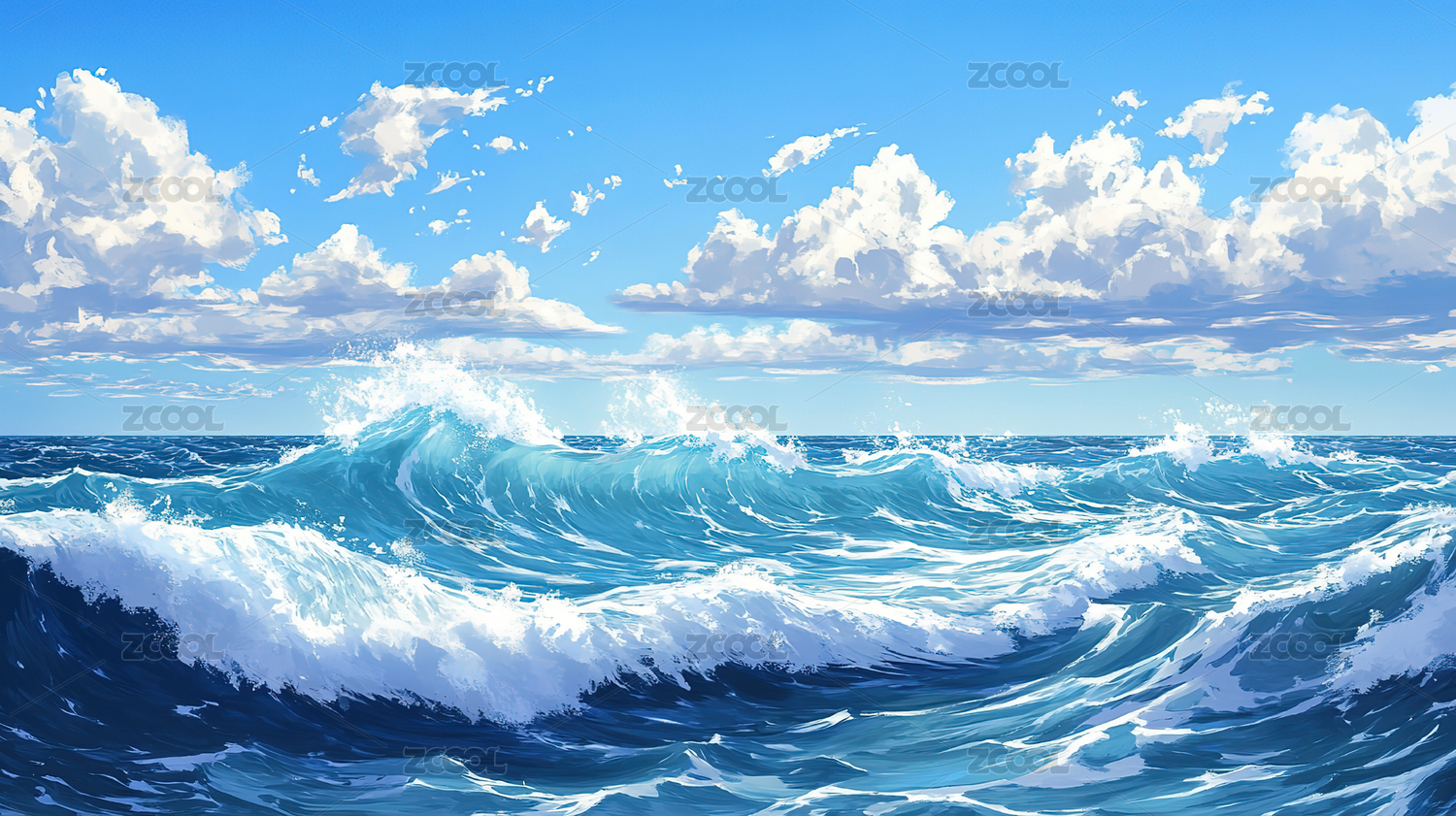 夏日海滩海浪插画,大暑节气海边度假概念插