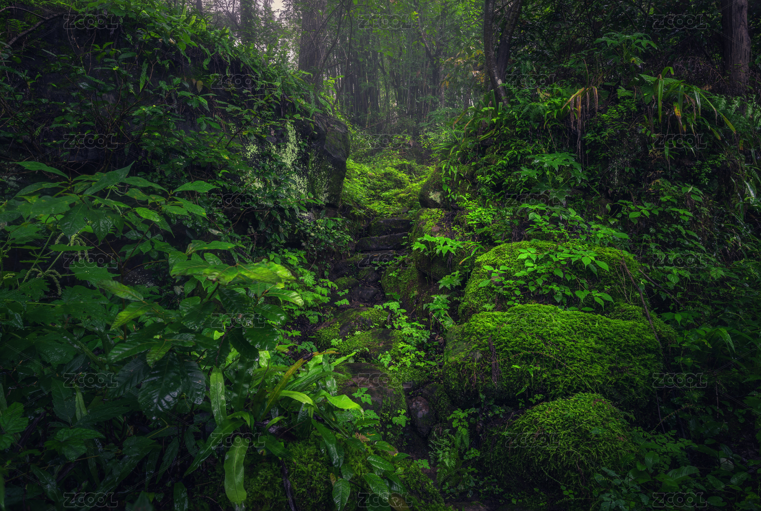 深山老林中巨型石头铺就的蜿蜒崎岖的山路