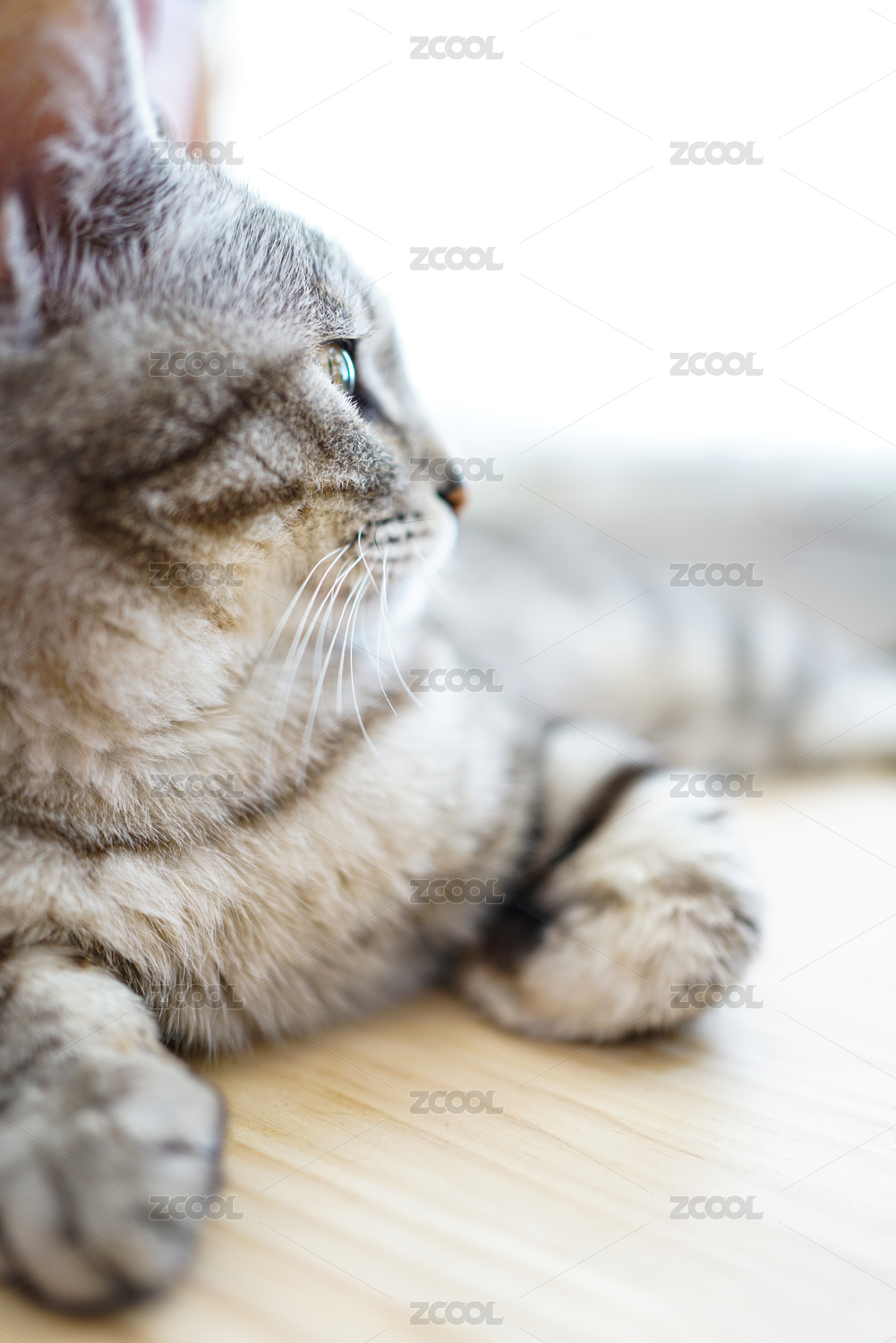 一只室内灯光下俯卧的黑白条纹宠物猫