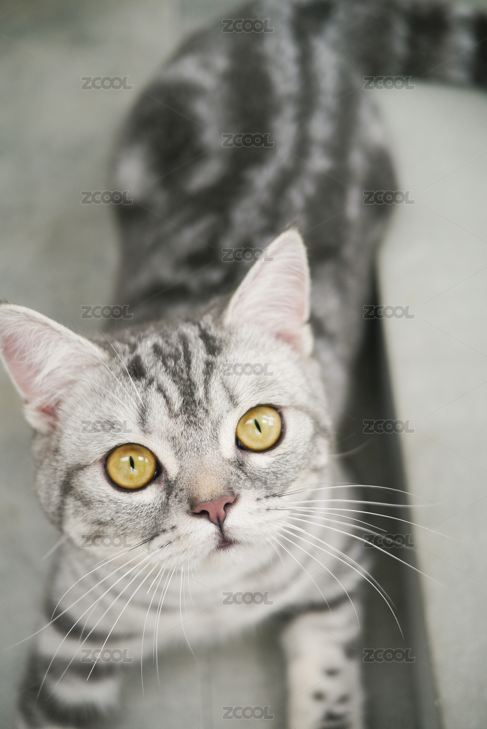 仰视一只室内灯光下俯卧的黑白条纹宠物猫