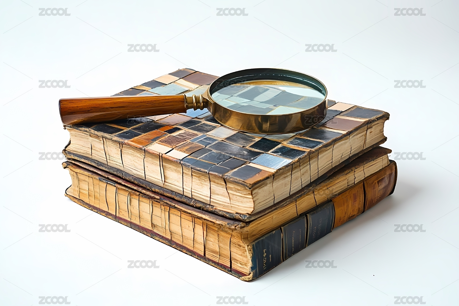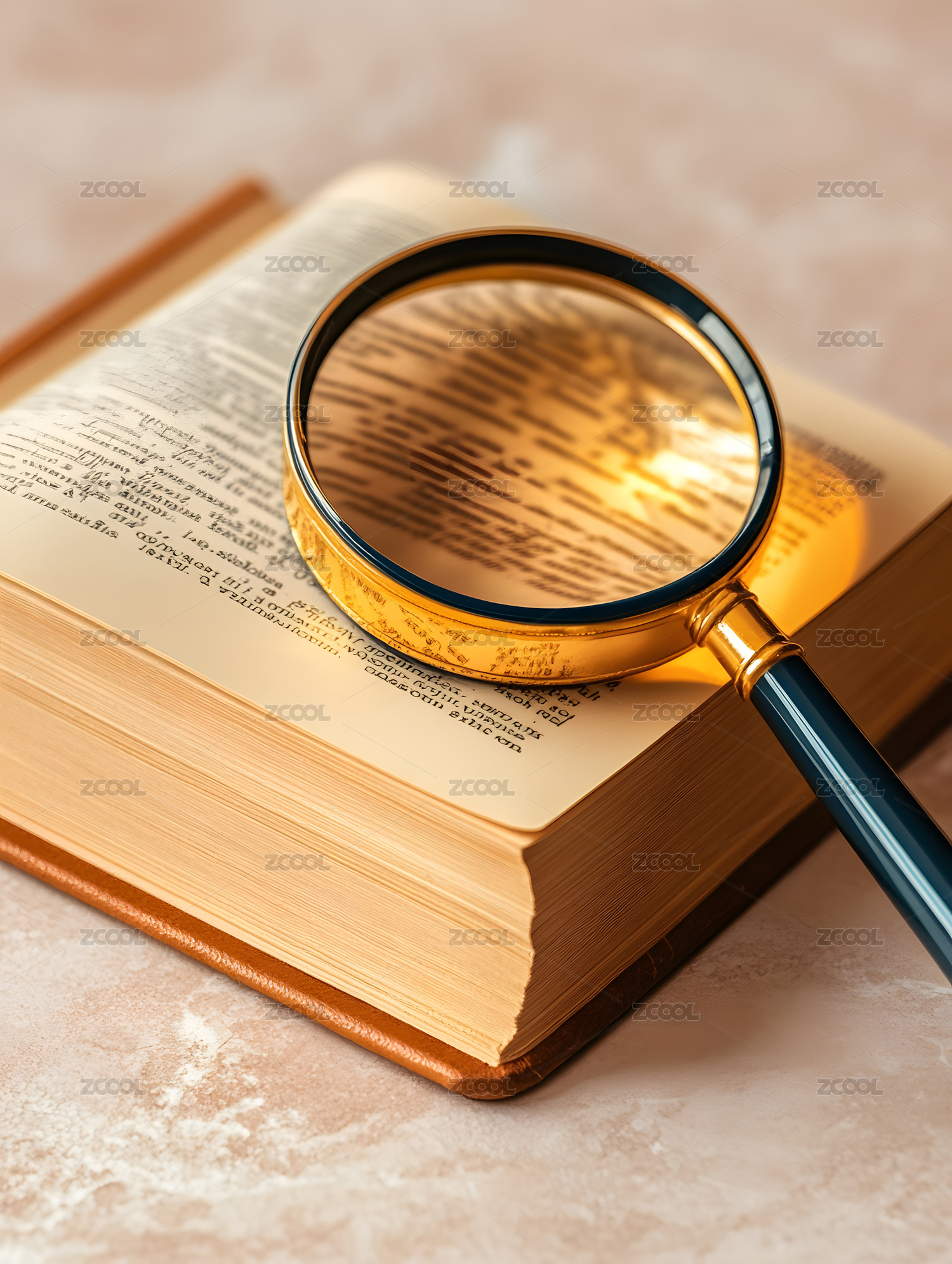 翻开的书和书上的放大镜及放大镜里观察到的硬币