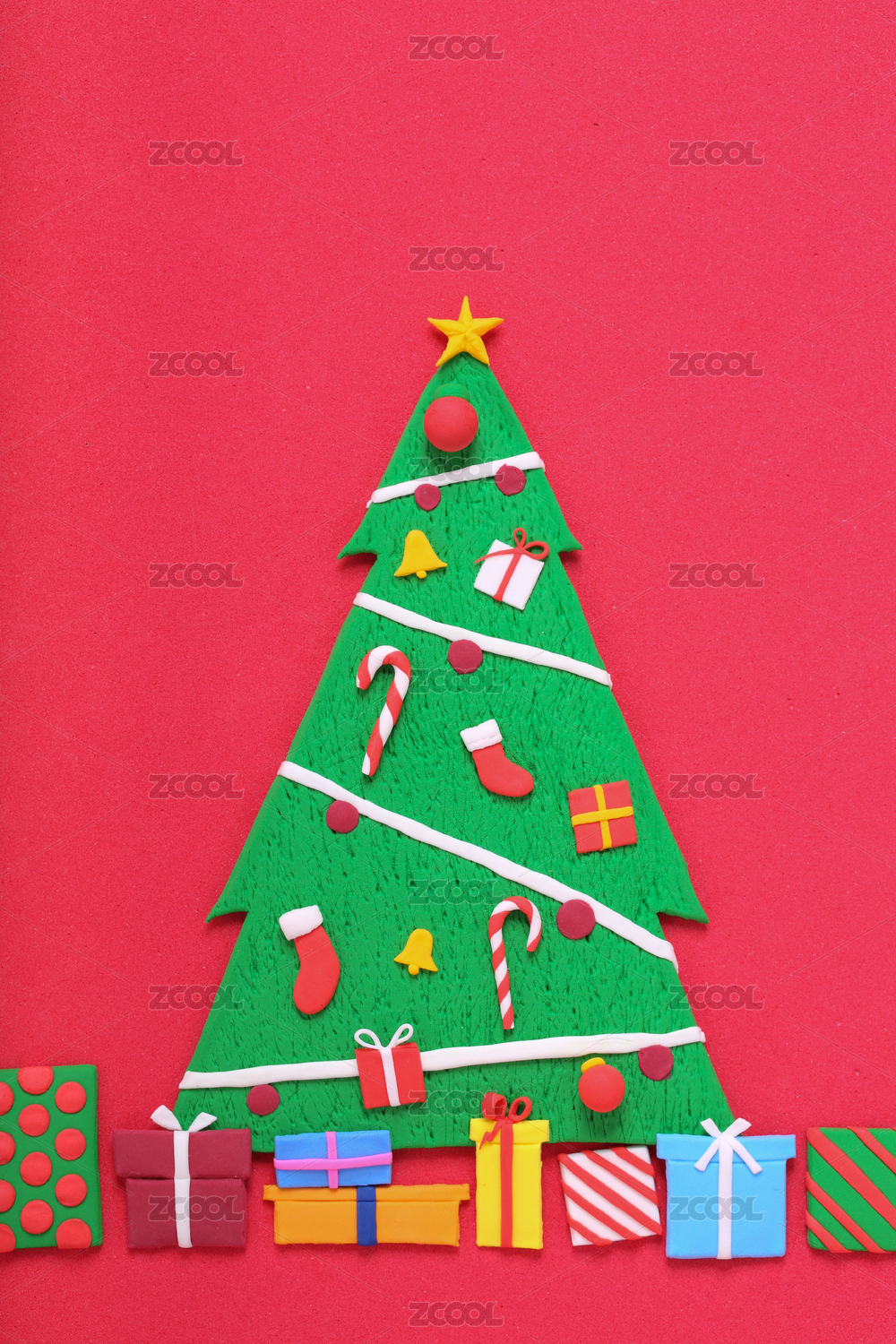 红色海绵纸上摆放彩色粘土捏制的圣诞树和堆放的礼盒