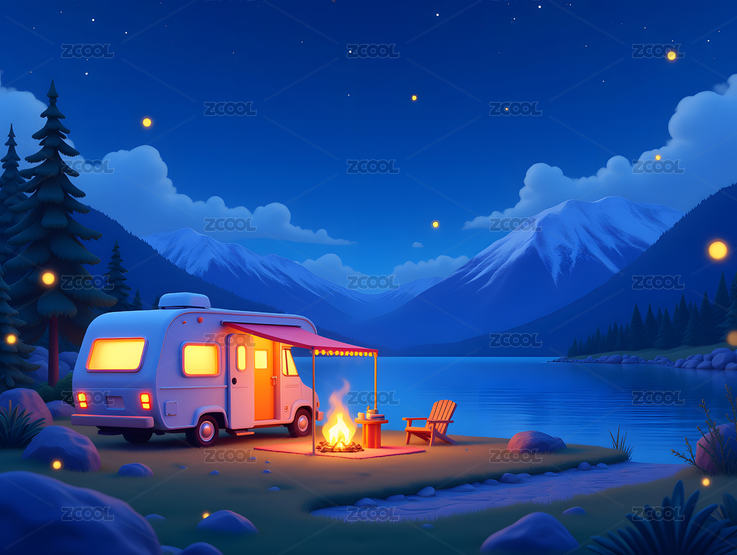 夜晚户外年轻人在篝火旁弹琴聚会露营