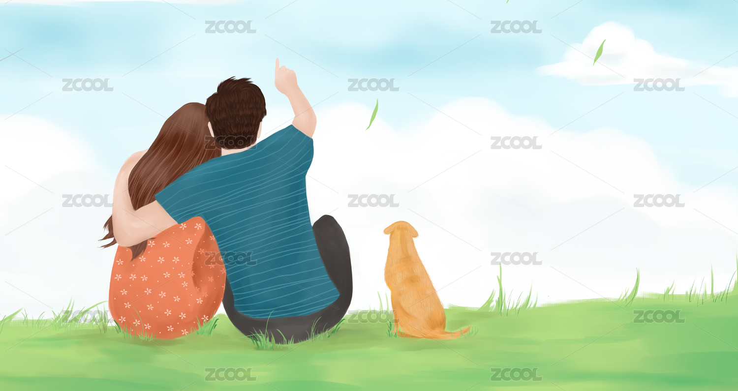 一对情侣在户外绿色草原上看风景插画背景