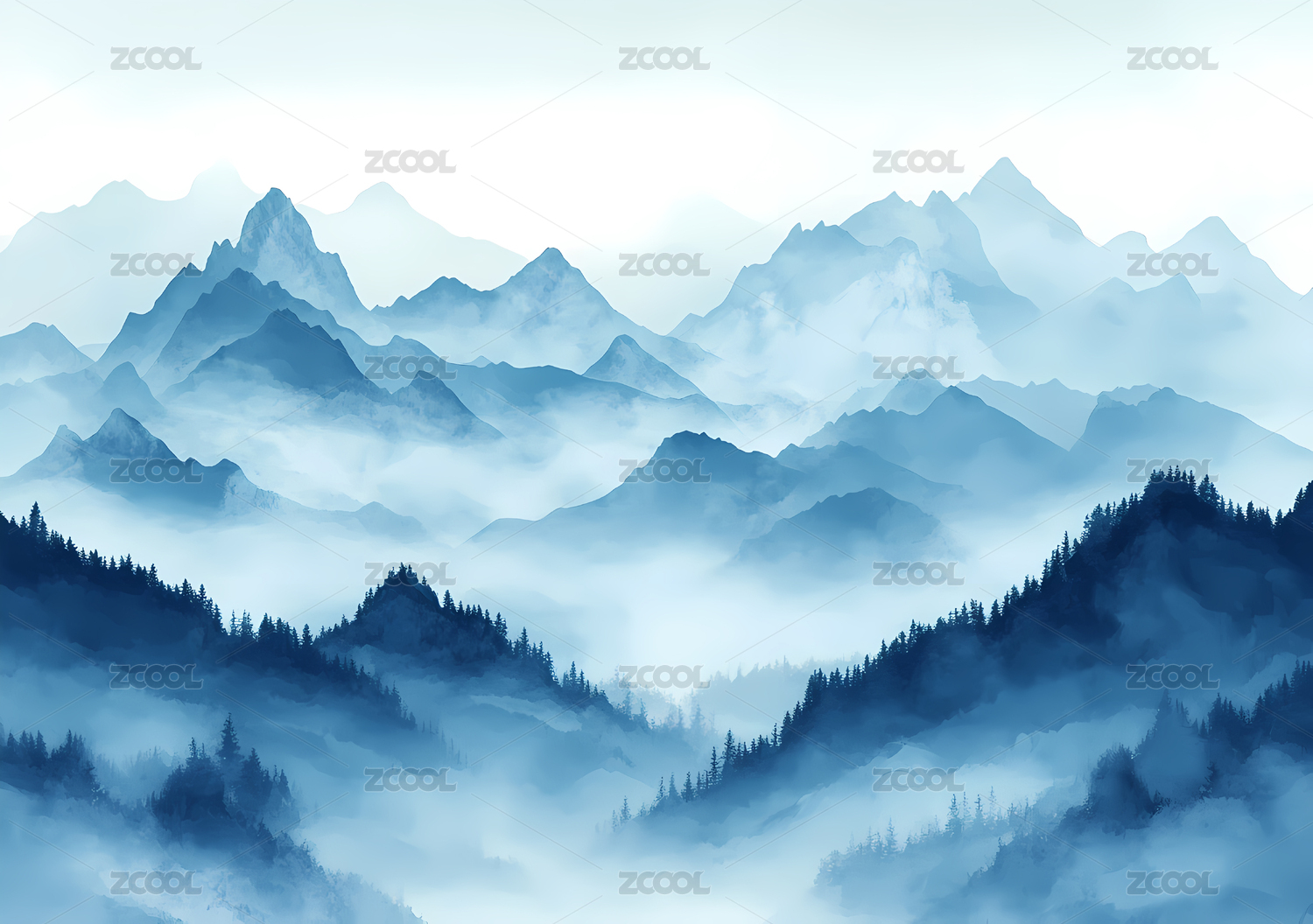 春天山峰森林里烟雨朦胧,中国风的水墨山水插画背景