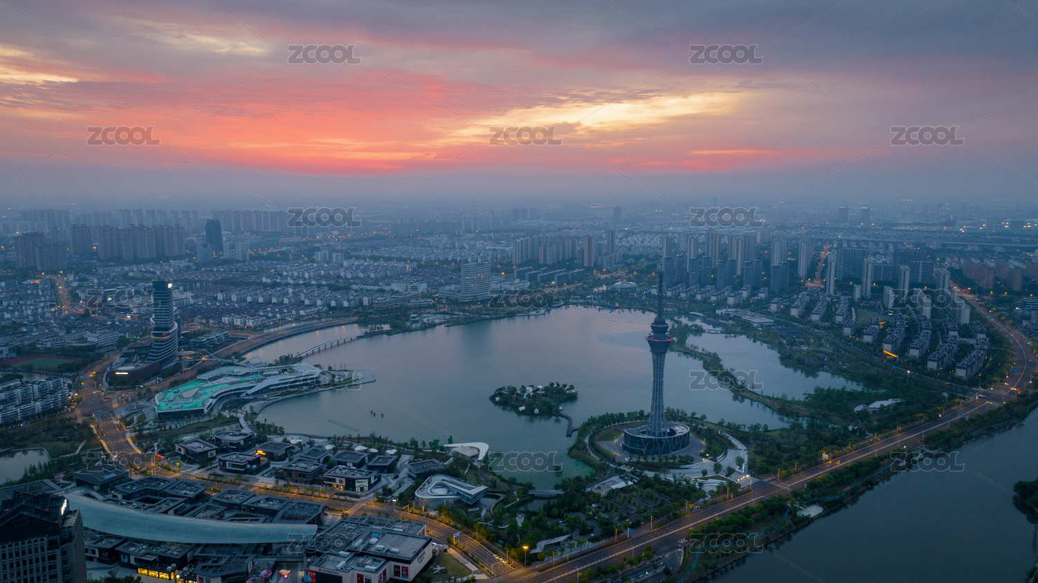 朝霞万里绕岚扶江南古城常熟电视塔周边风光