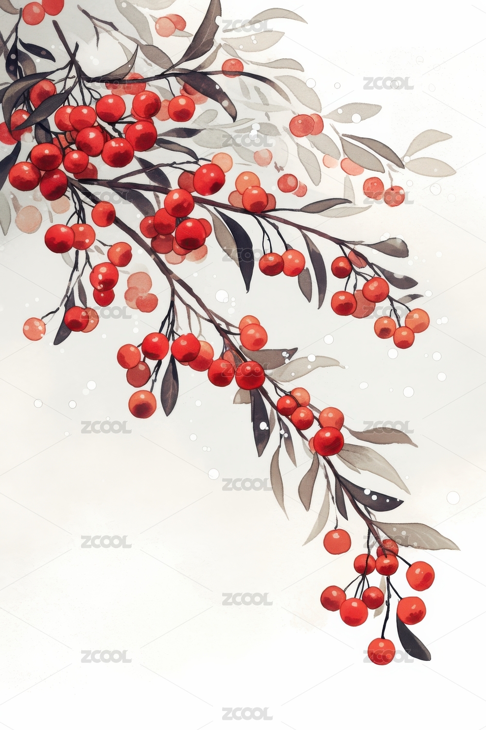 红色浆果与绿叶的美丽插画