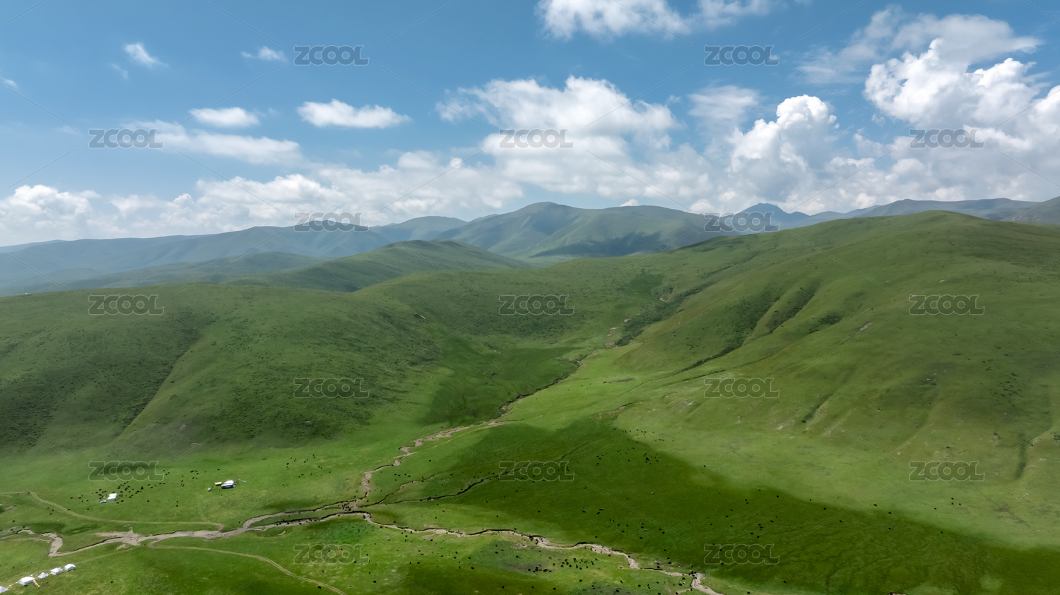高原山谷绿色草地蓝天白云