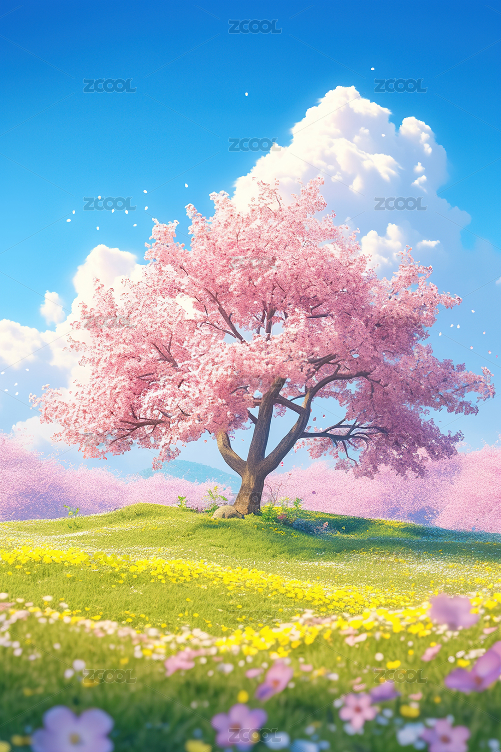 樱花草地天空唯美插画