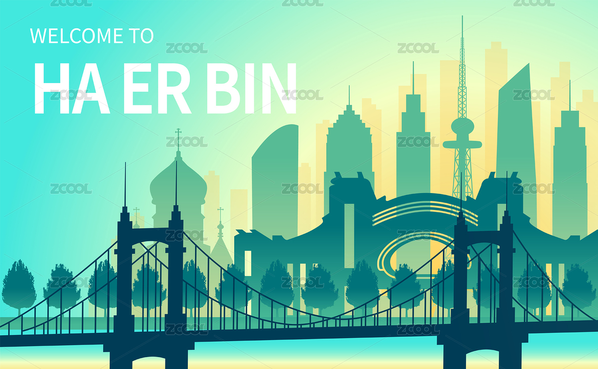 中国,黑龙江,哈尔滨,城市,风景,地标,建筑,天际线,矢量,插画
