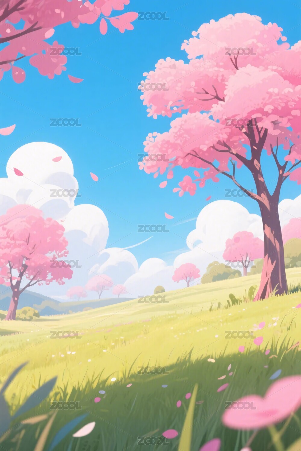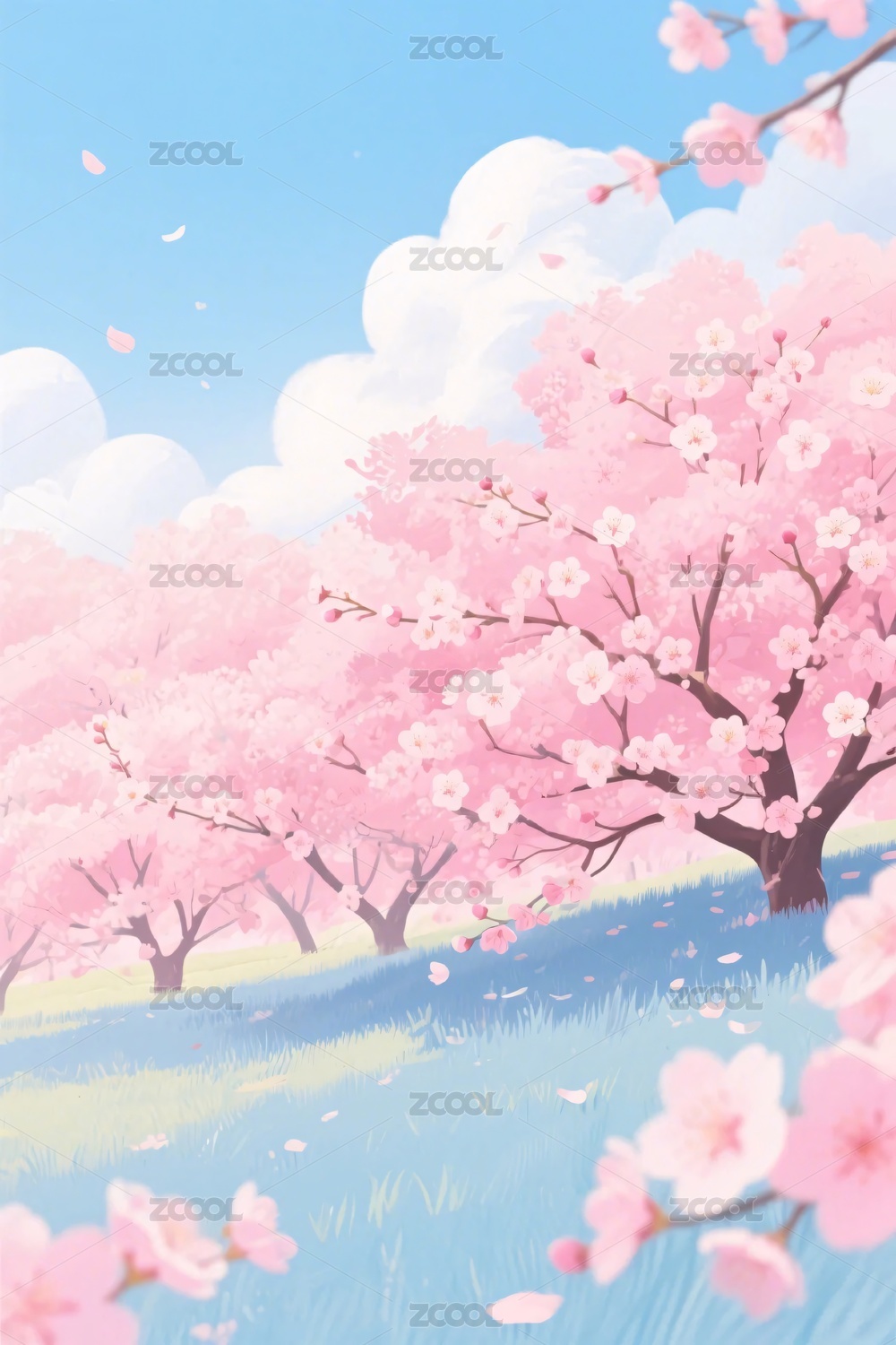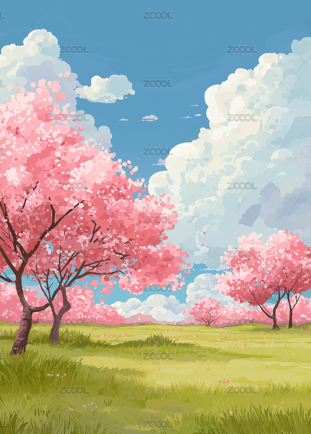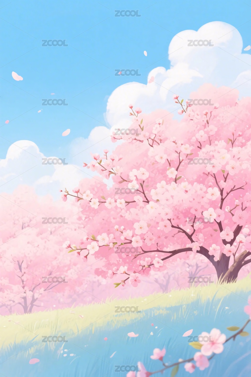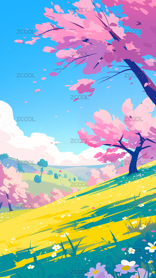 粉色樱花树草地蓝天治愈系插画背景素材