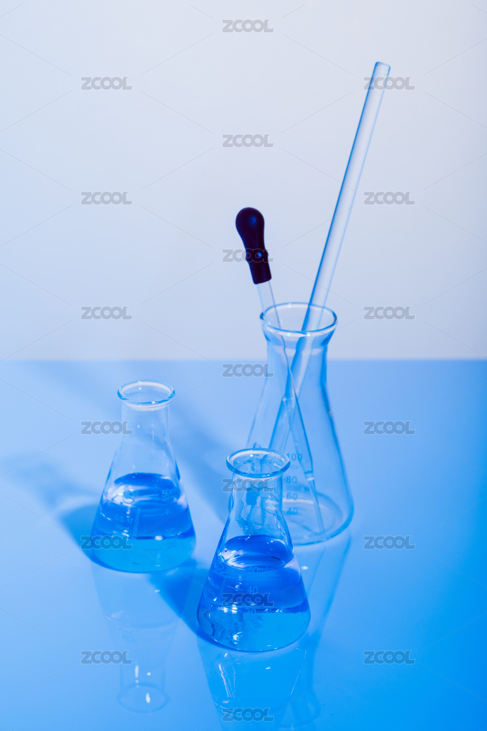 简洁蓝色背景前的生化医疗实验玻璃仪器