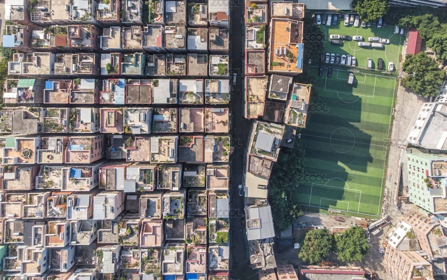 中国广东广州密集的城中村与足球场
