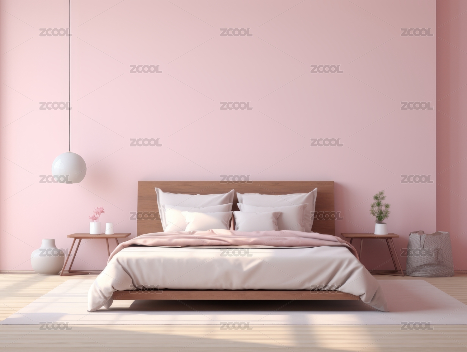 现代简约卧室的粉红色墙壁与白色床品