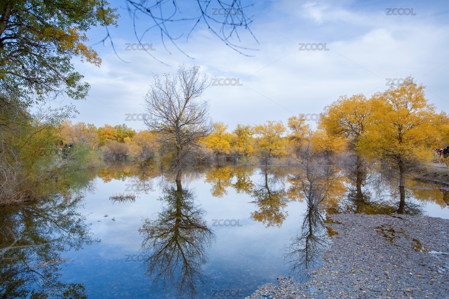 中国酒泉金塔秋天胡杨林蓝天白云水面光影
