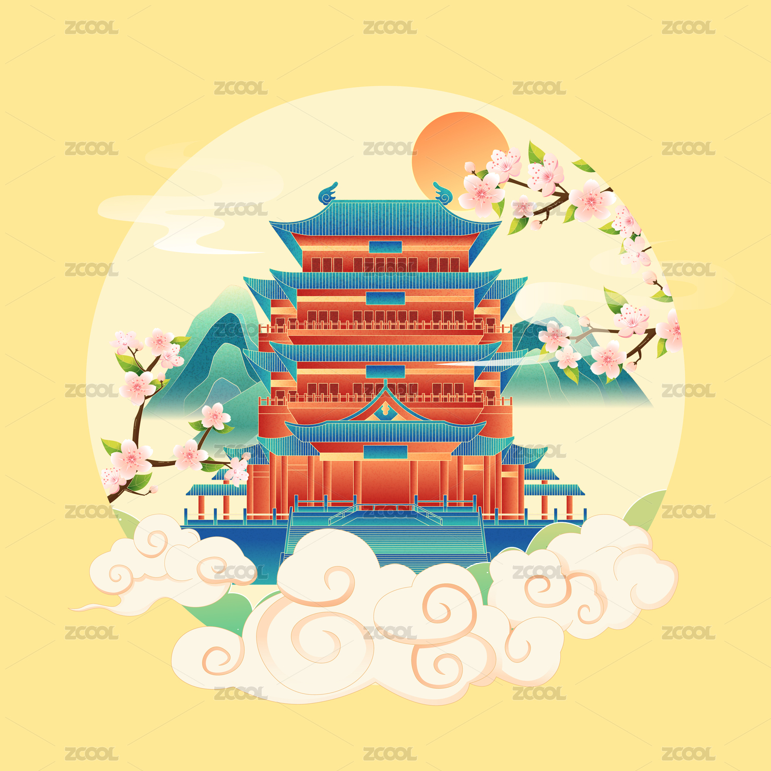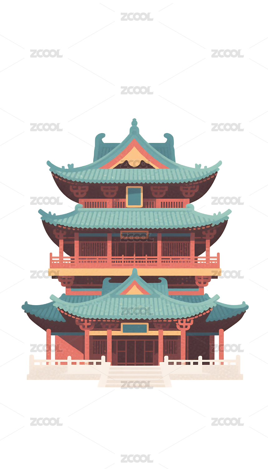 国潮风格古建筑插画素材