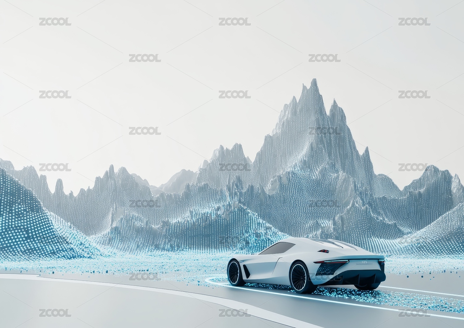 卡通,3D,汽车,行驶,出行,山峰,雪山,粉色,道路,白昼