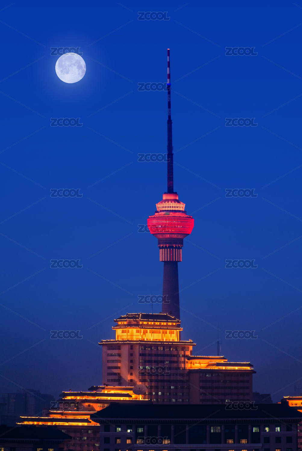 北京市夜晚月亮光照西城区中央电视塔建筑