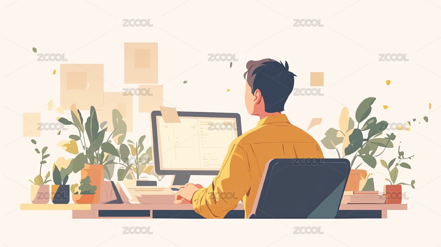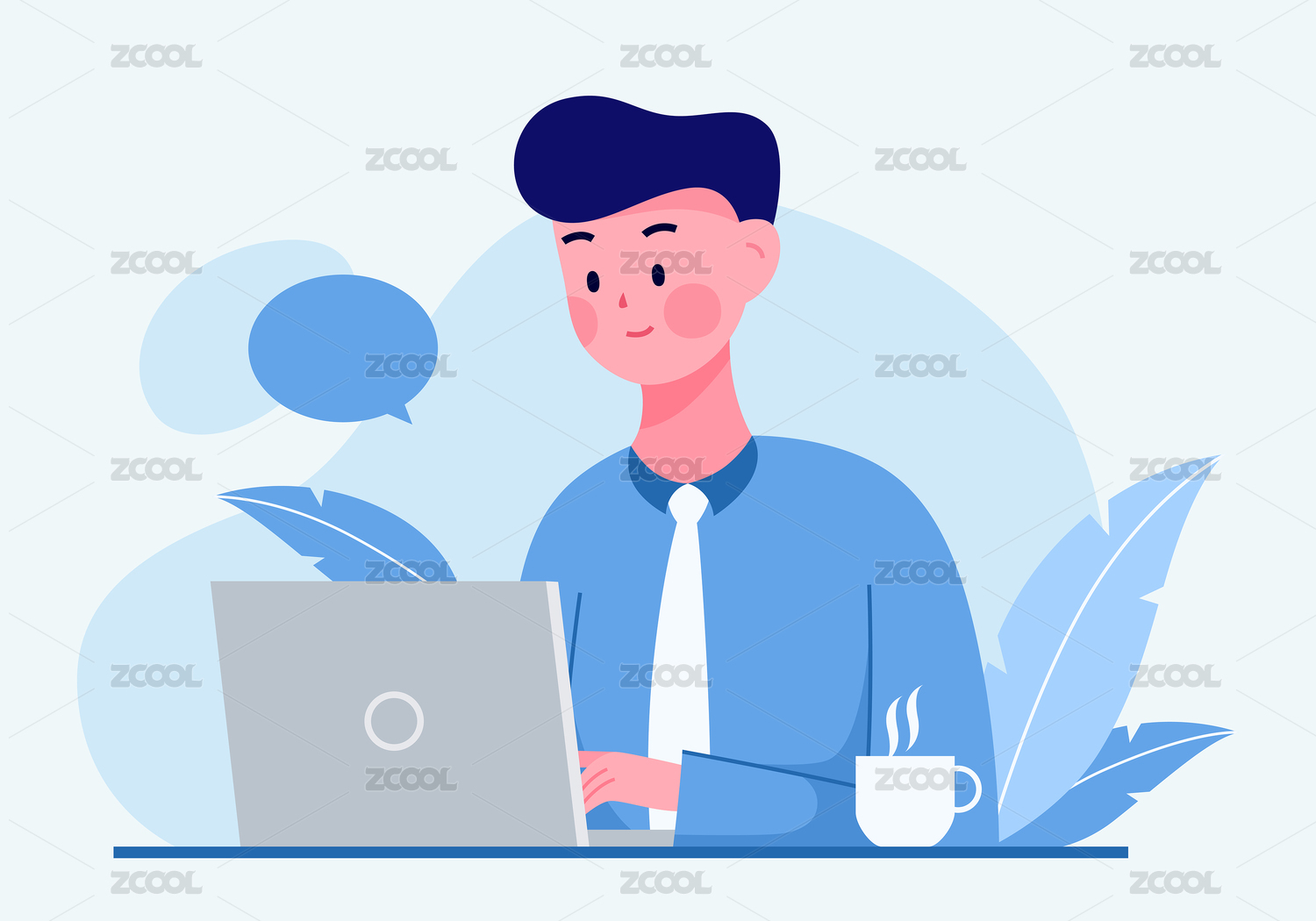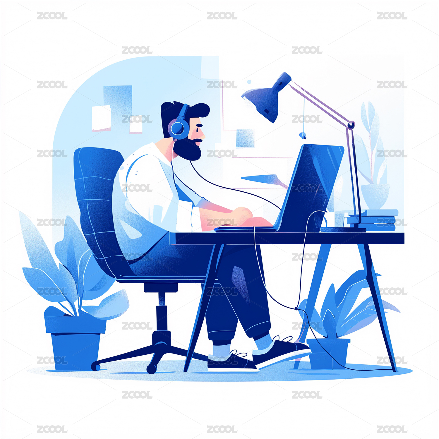 电脑前工作的男人矢量插画扁平风格蓝色调