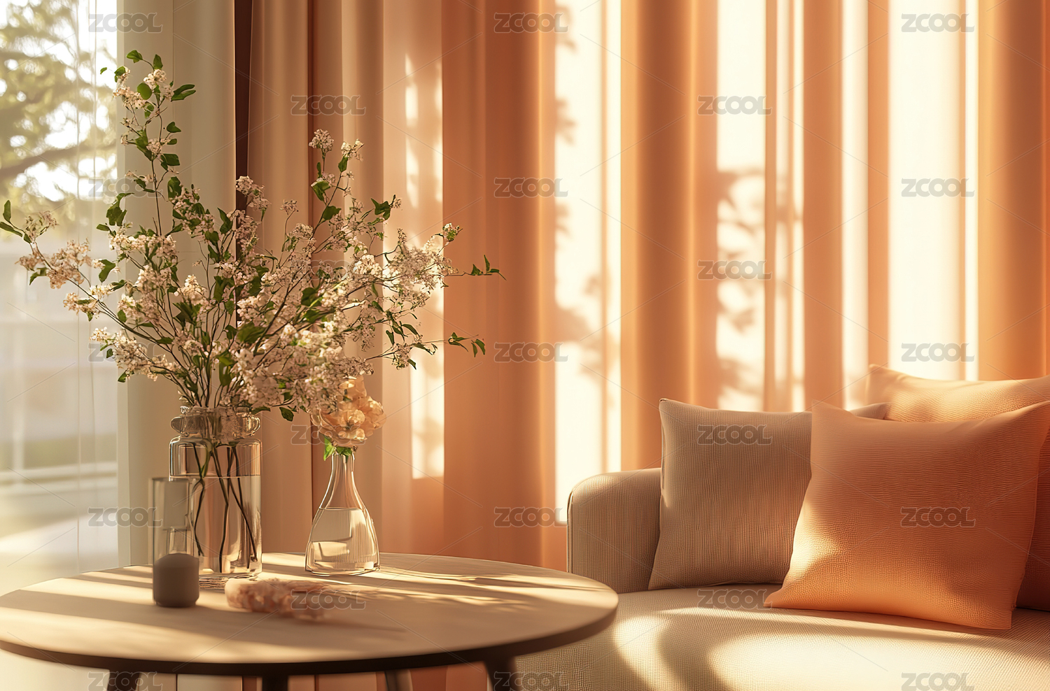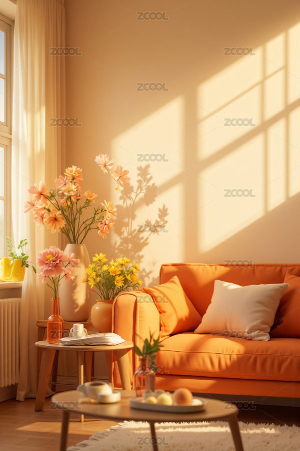 客厅,沙发,花束,家居,室内,装饰,温馨,舒适,自然光,落地窗