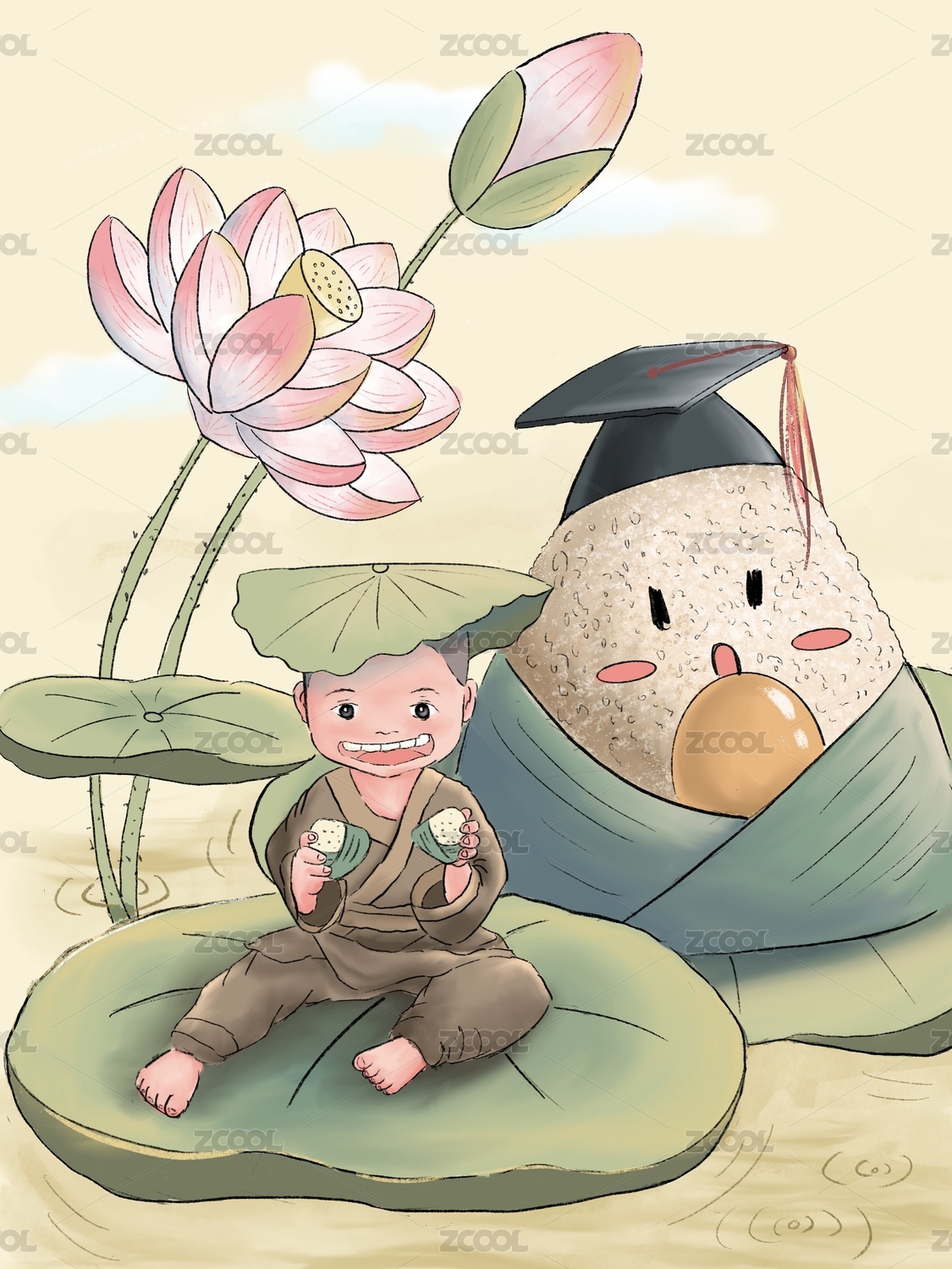 小男孩拿着两个粽子坐在荷叶上旁边有个大粽