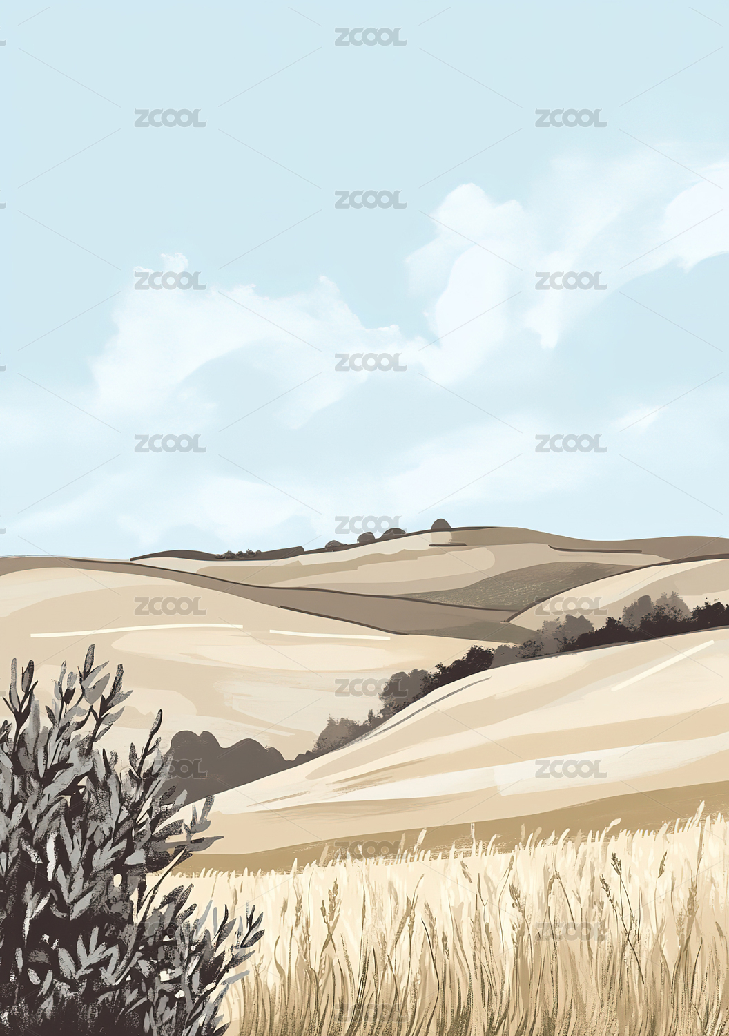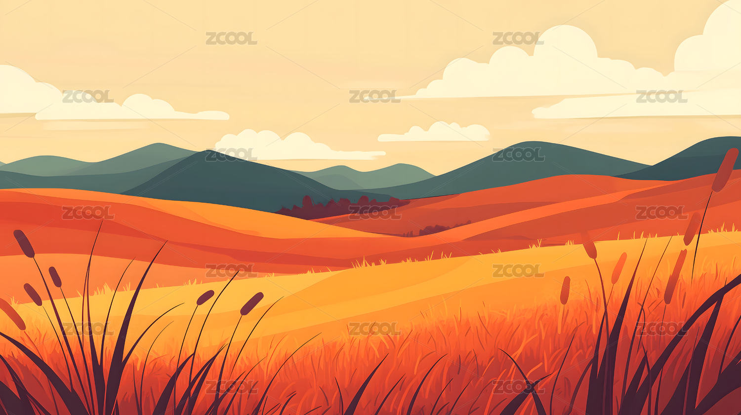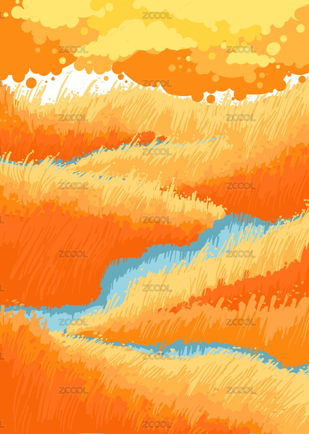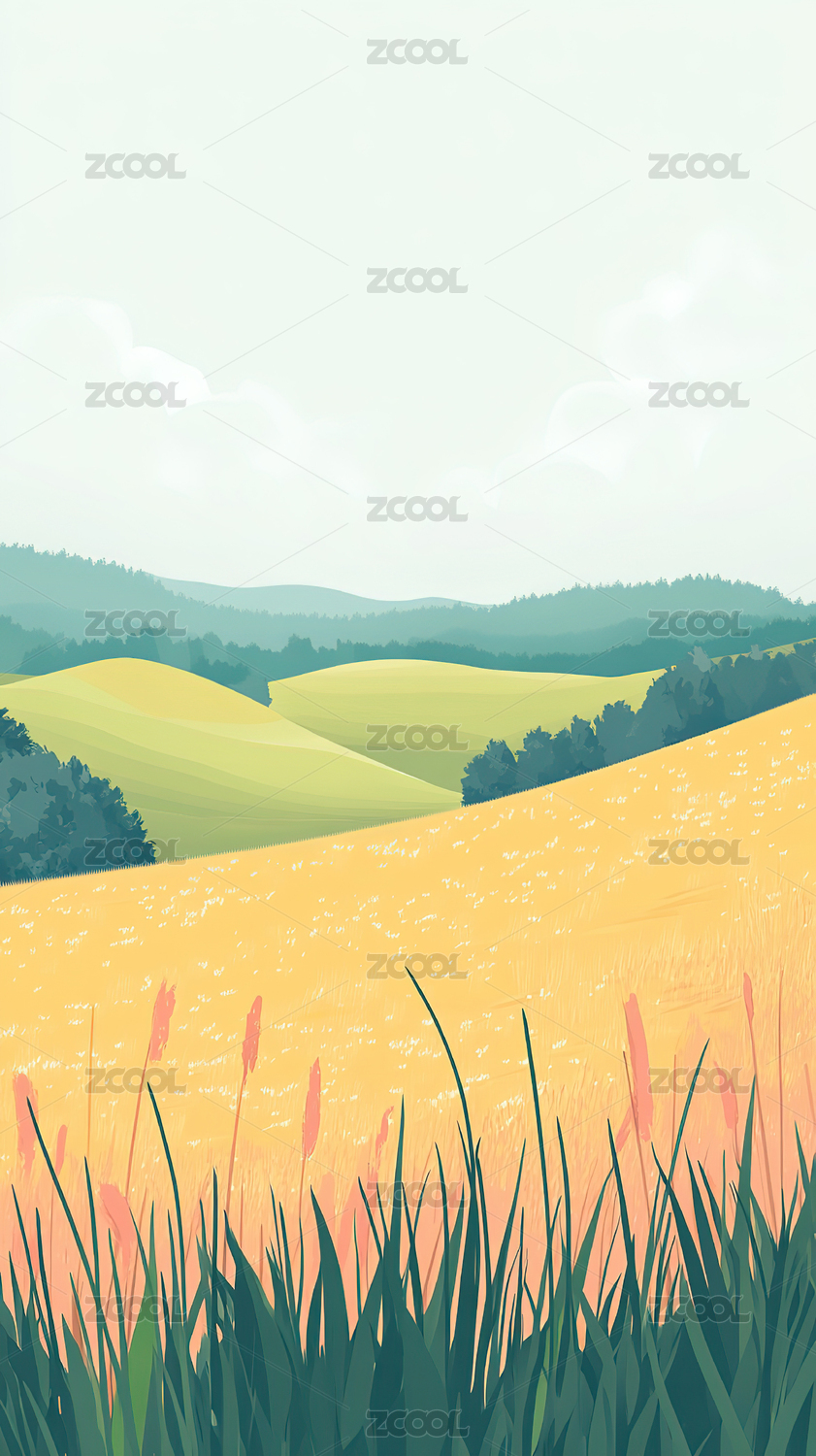 小清新风格,秋天,田野,麦田,插画,背景,黄色,橙黄色,大自然,郊区