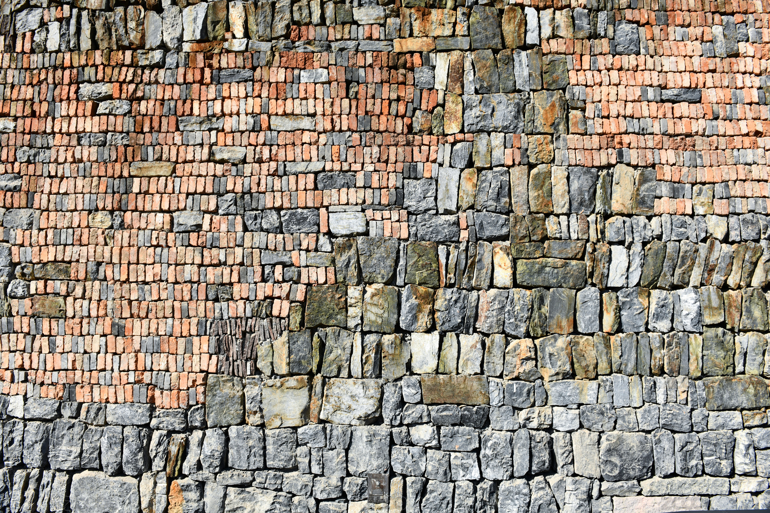 造型古朴的火山岩石墙上一枝绿色常春藤