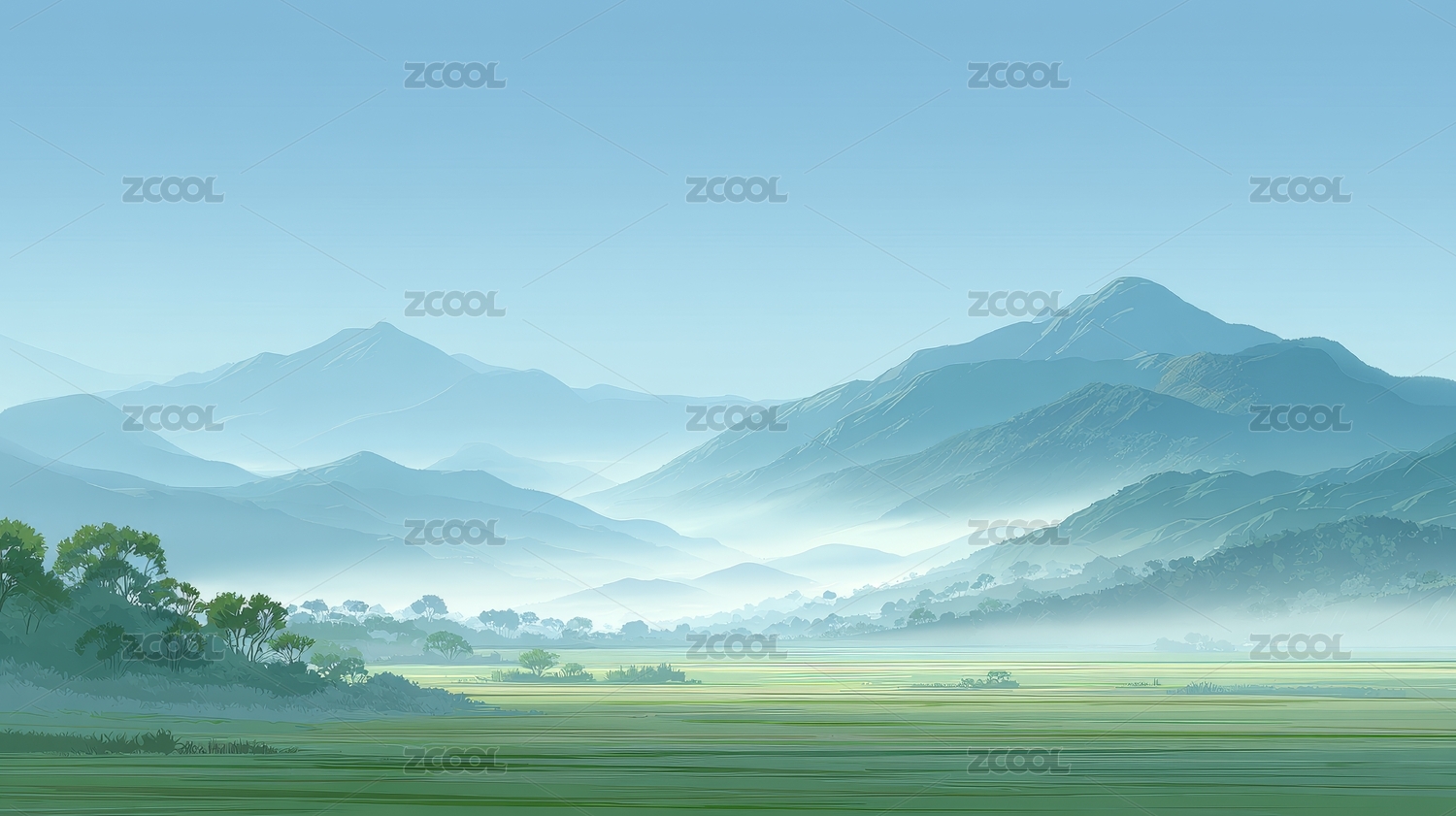 雾霭山峦与青青草原