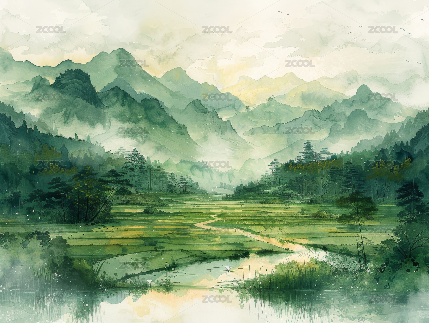 国风水彩田园风光插画