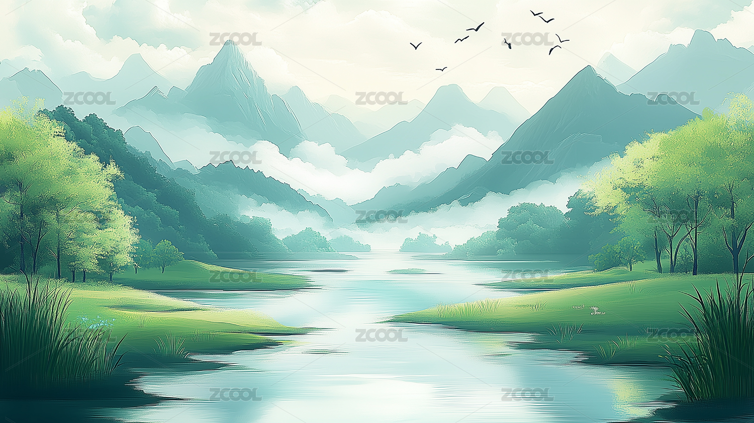 雾气缭绕的山水绿意图