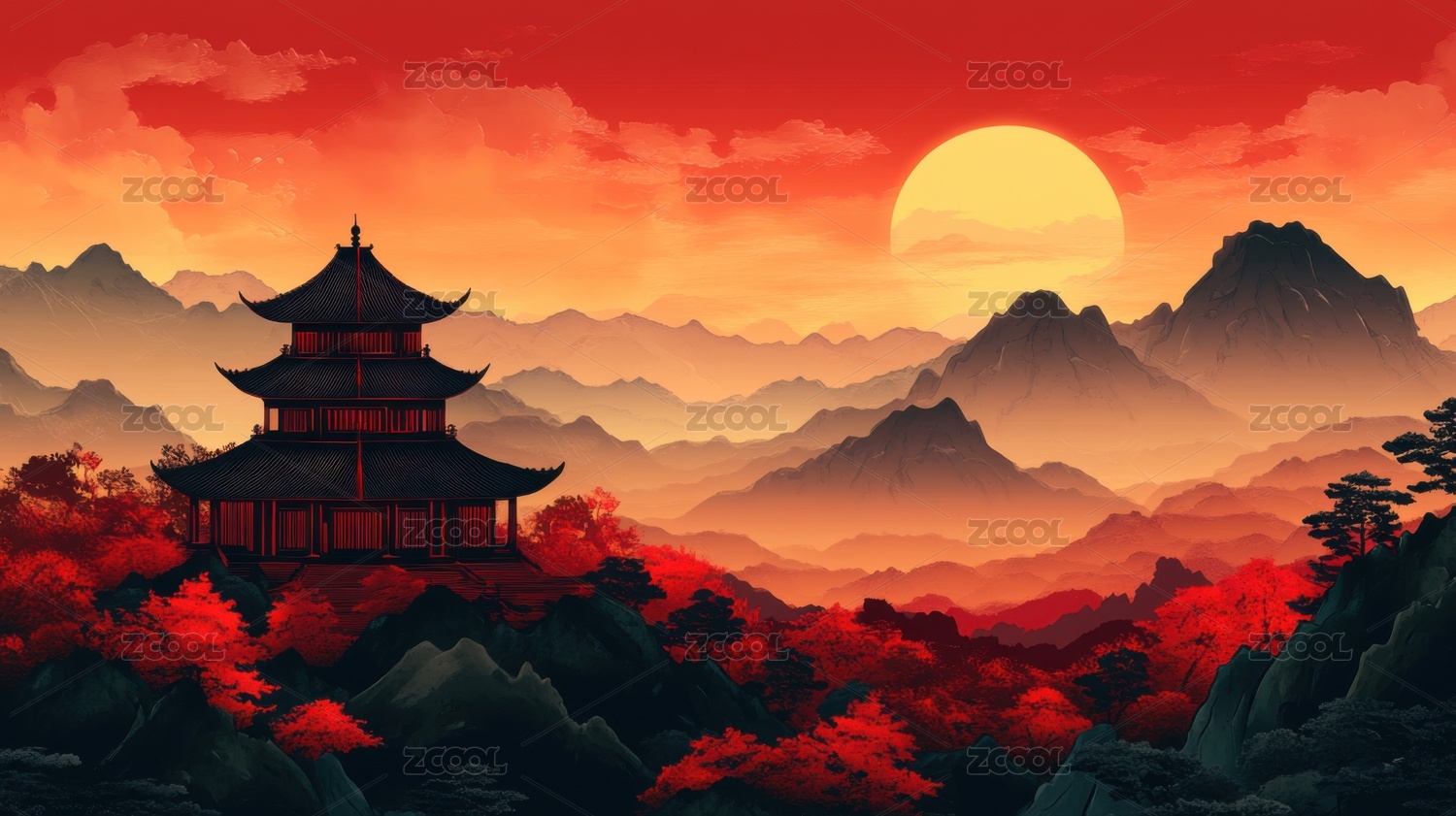 日落,亚洲,传统,塔楼,秋天,山间,雾气,红叶,橙色,天空