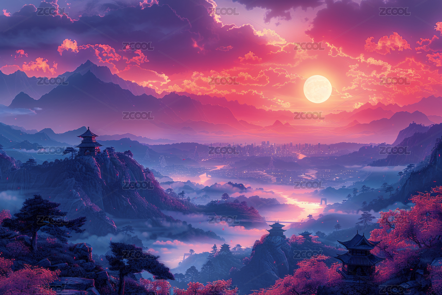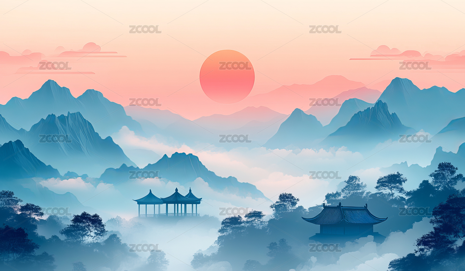 中国风建筑山脉云雾插画场景海报壁纸背景