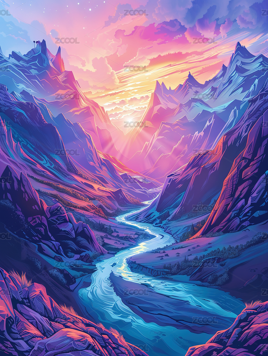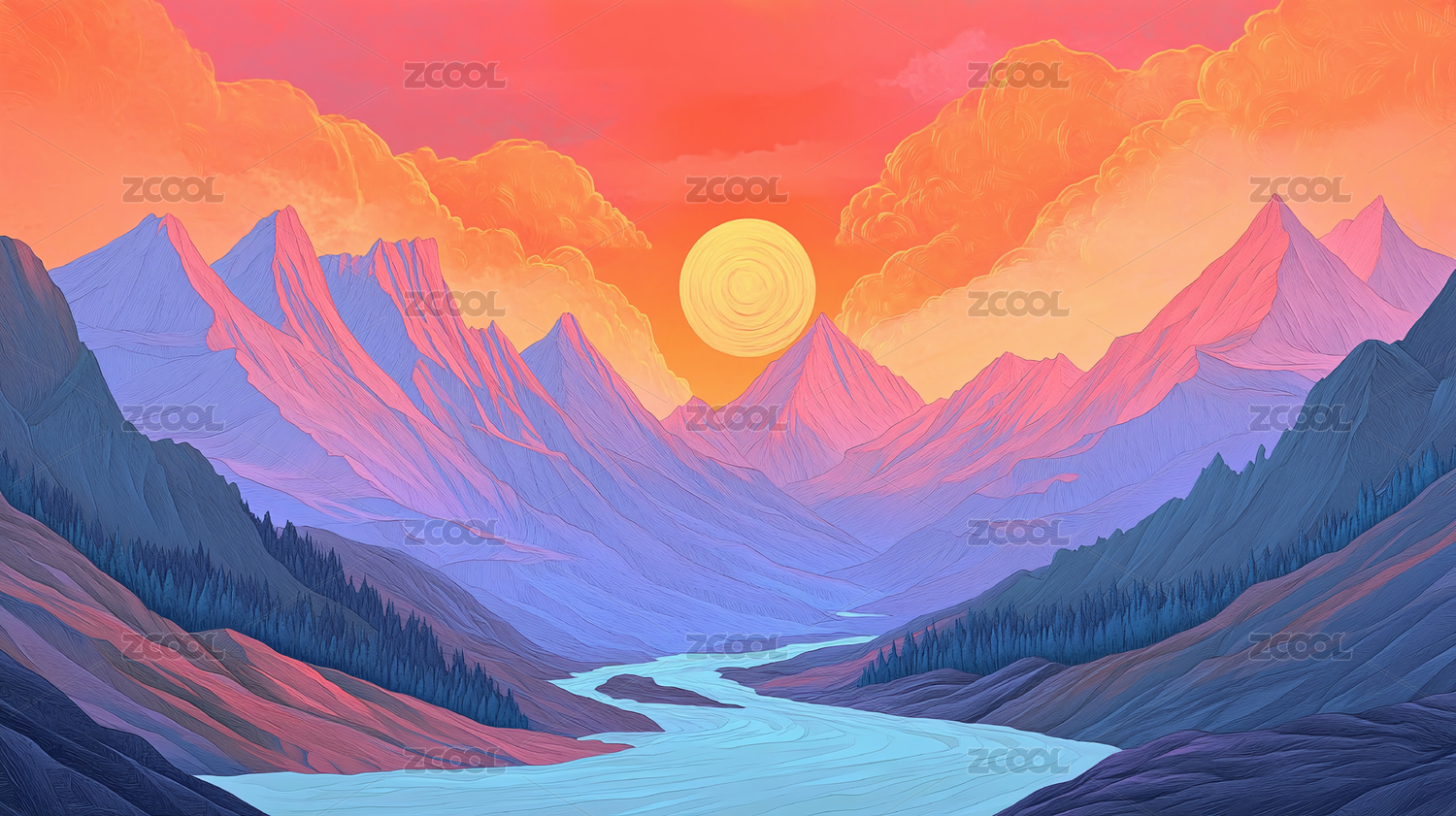 雪山与日出插画海报背景