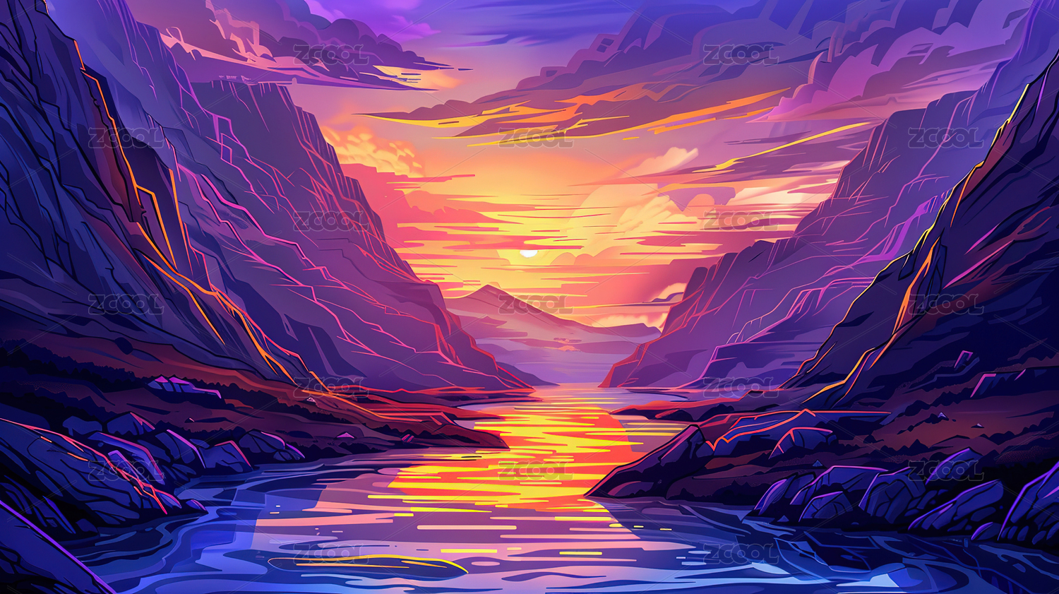 动漫山峰日出祥云插画