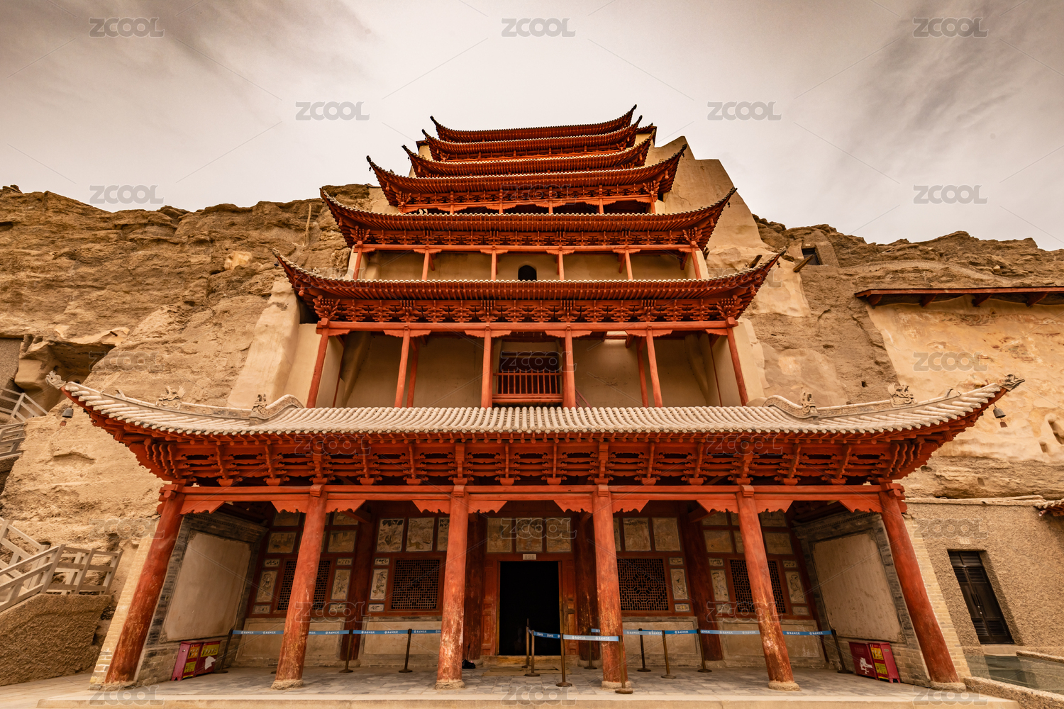 中国甘肃敦煌莫高窟老建筑九层楼全景图