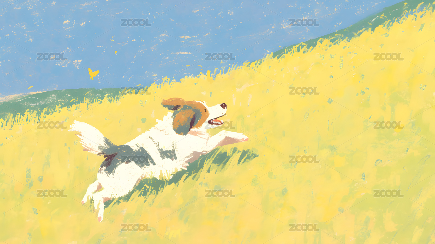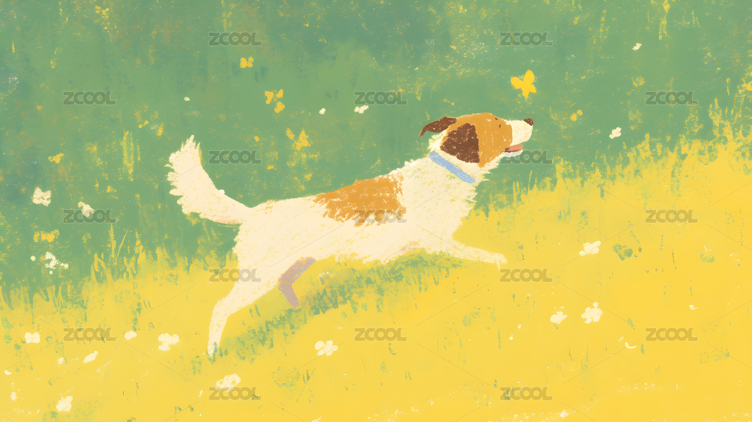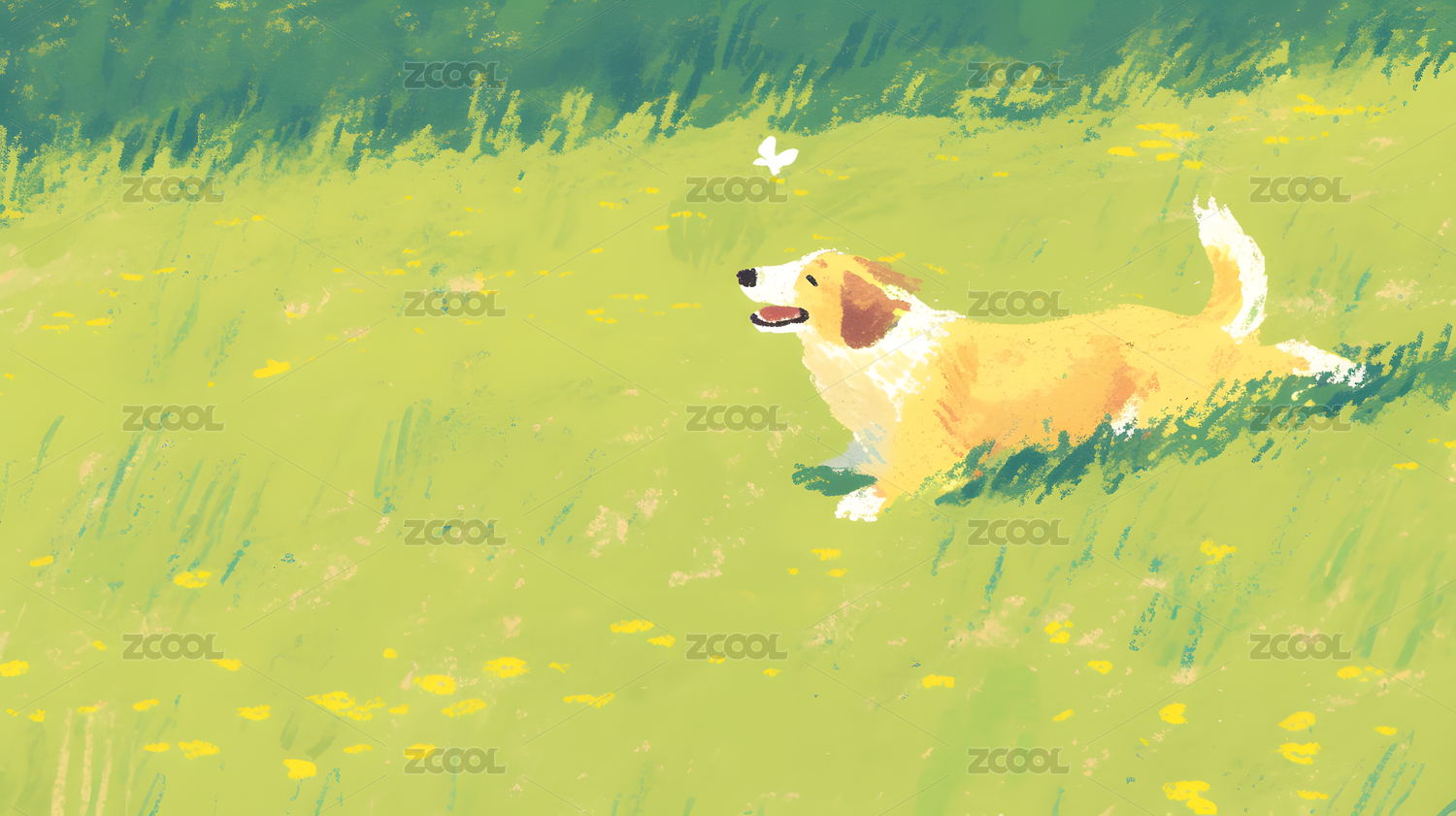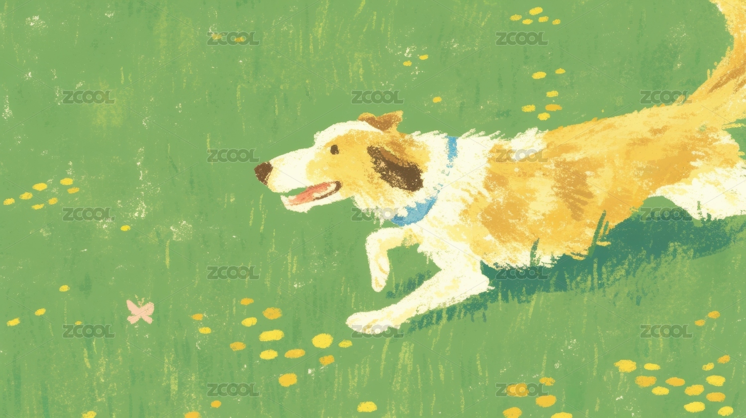 可爱小狗草地奔跑卡通插画