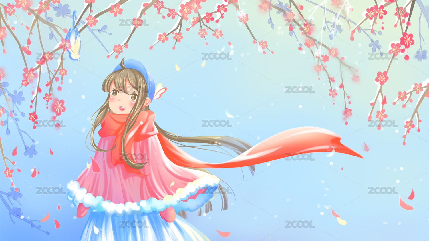 少女欣赏冬季梅花盛开的美景,蓝色粉色唯美卡通小清新冬天节气插画