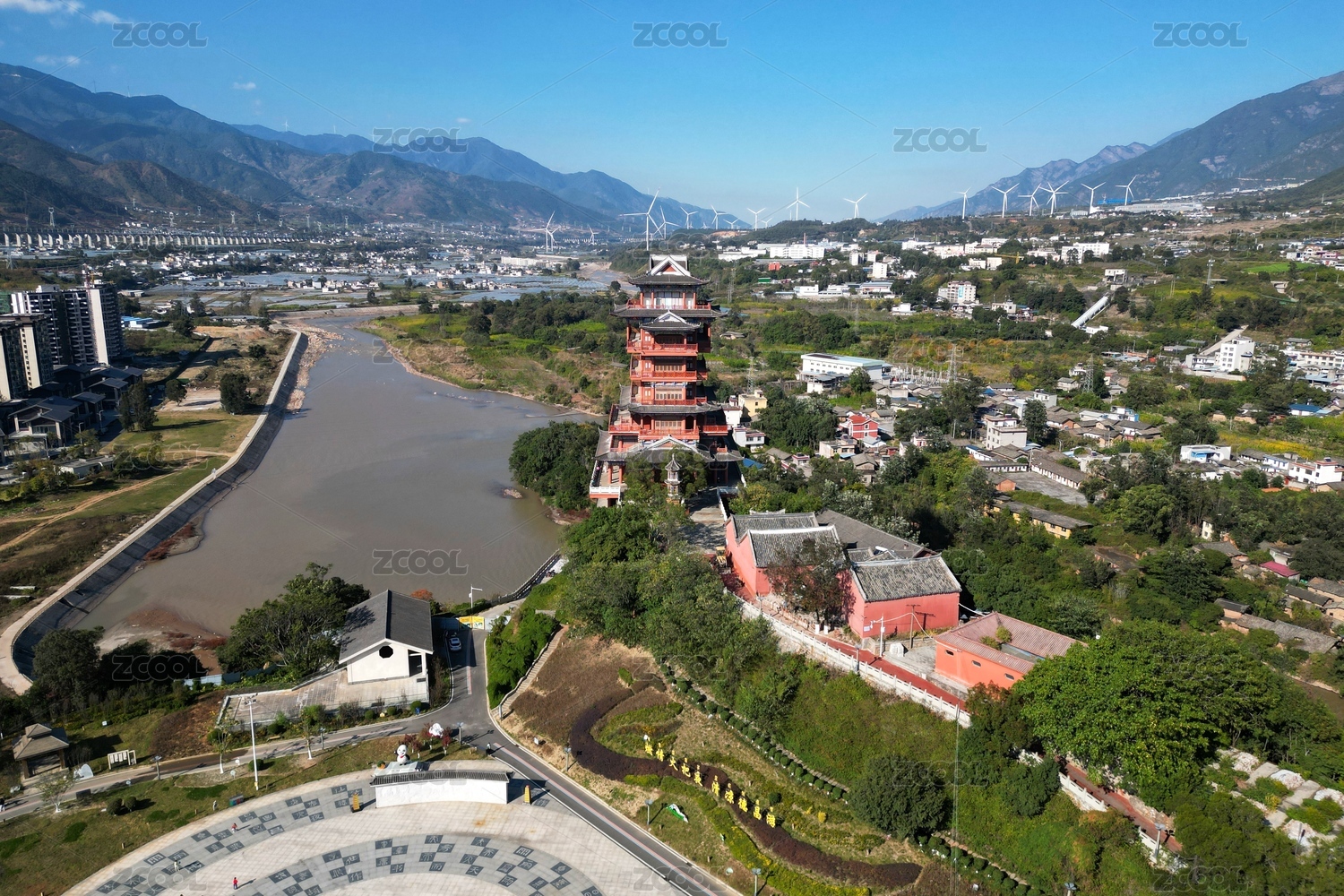 大理古城崇圣寺三塔白昼下午逆光航拍视角