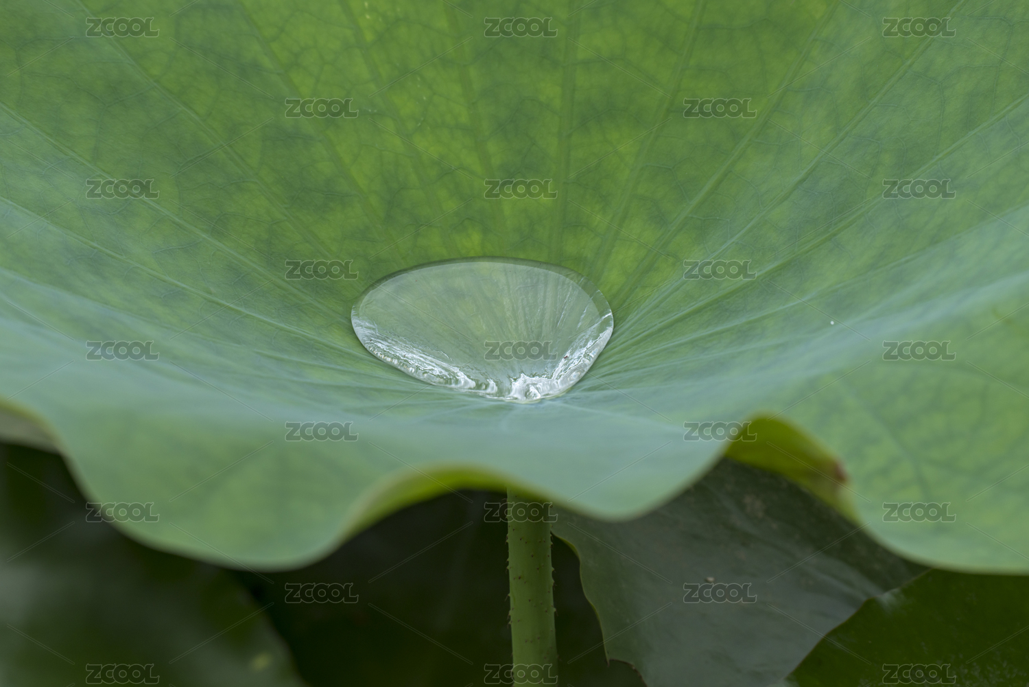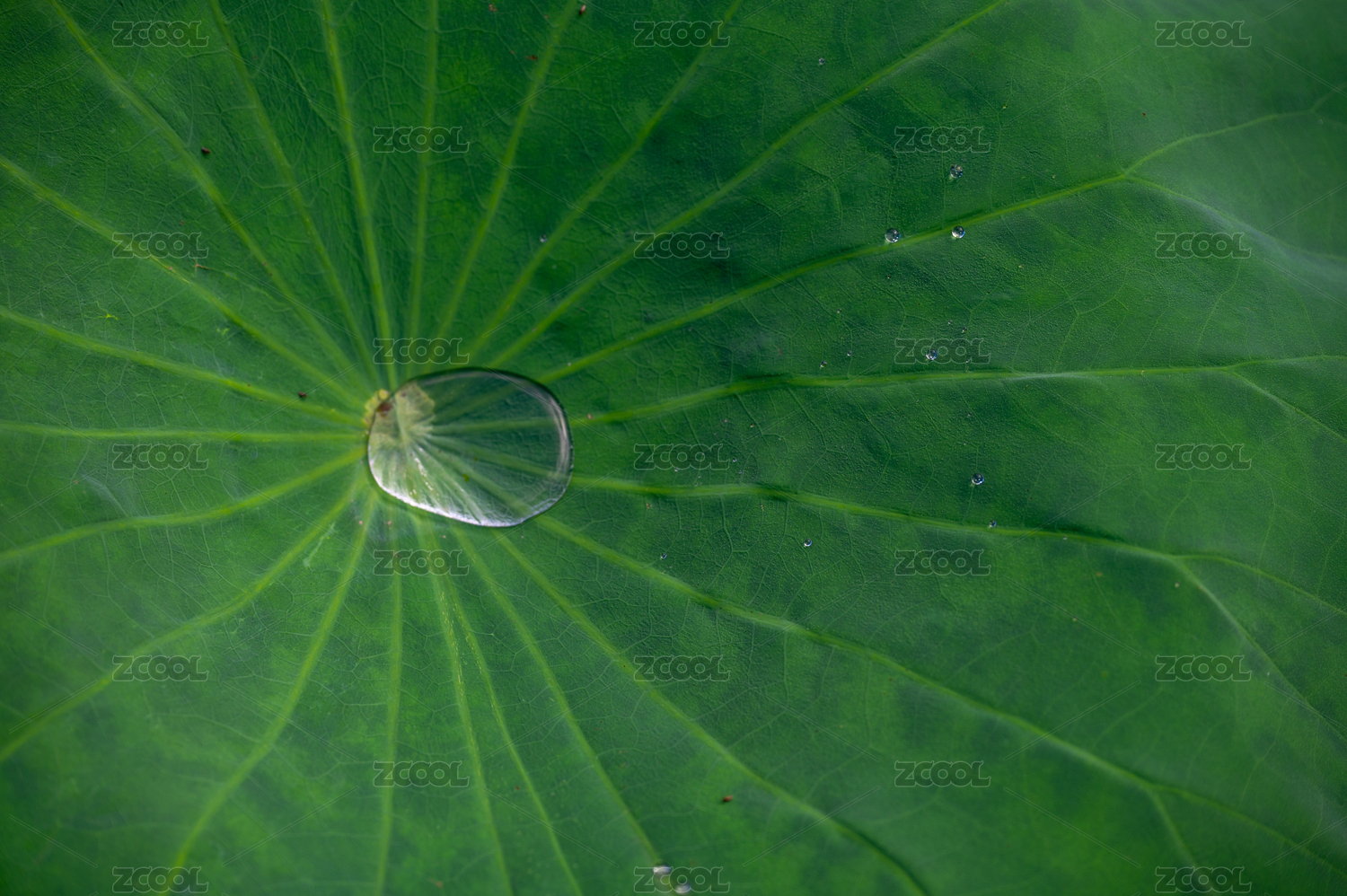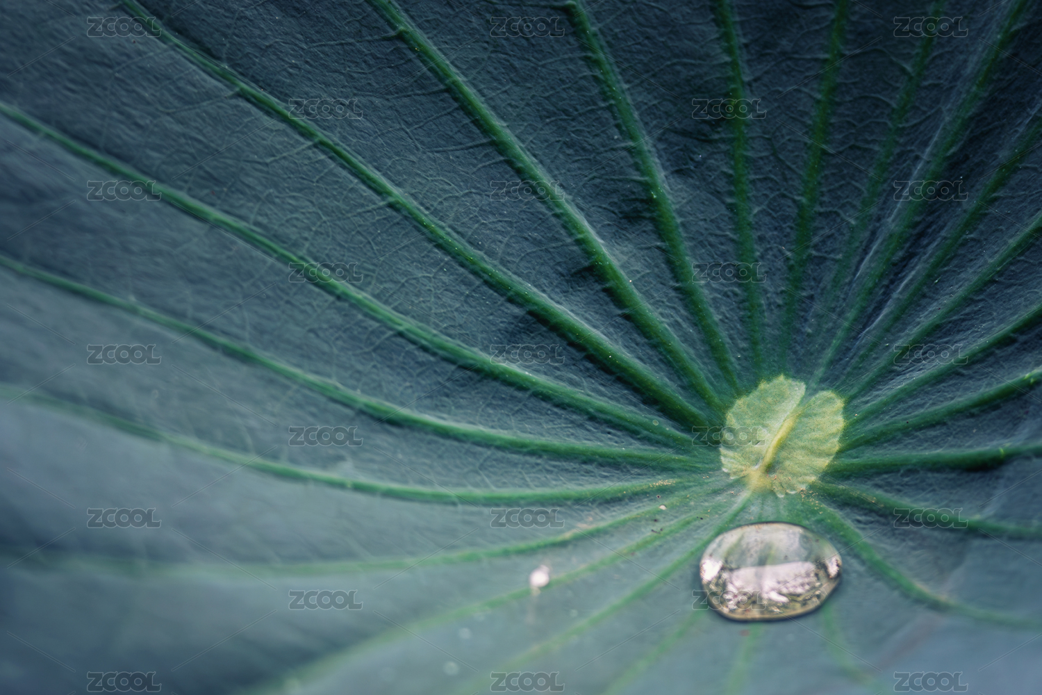 绿色荷叶上有一滴水珠,叶脉清晰成放射状