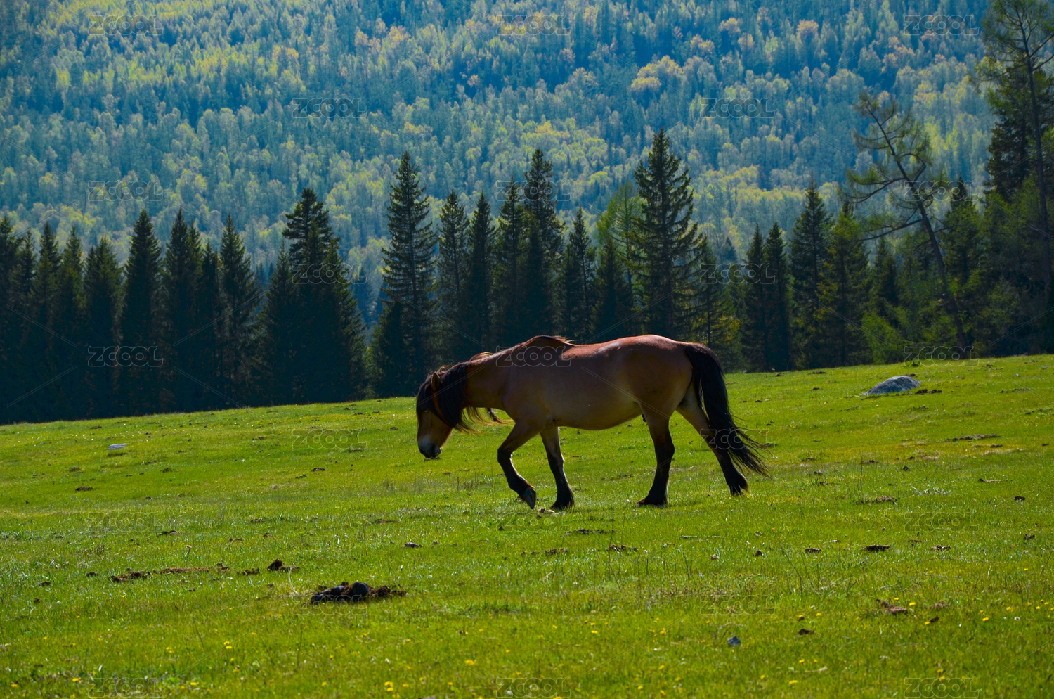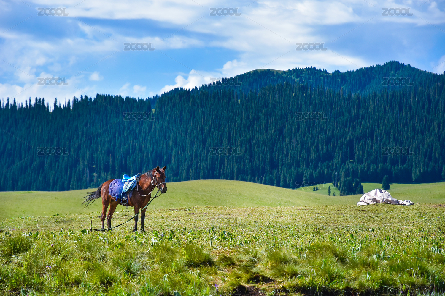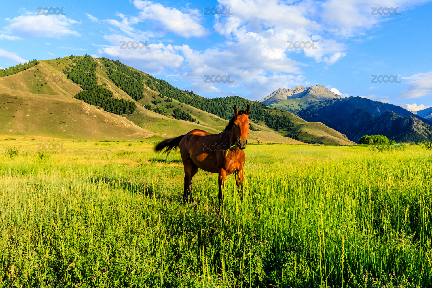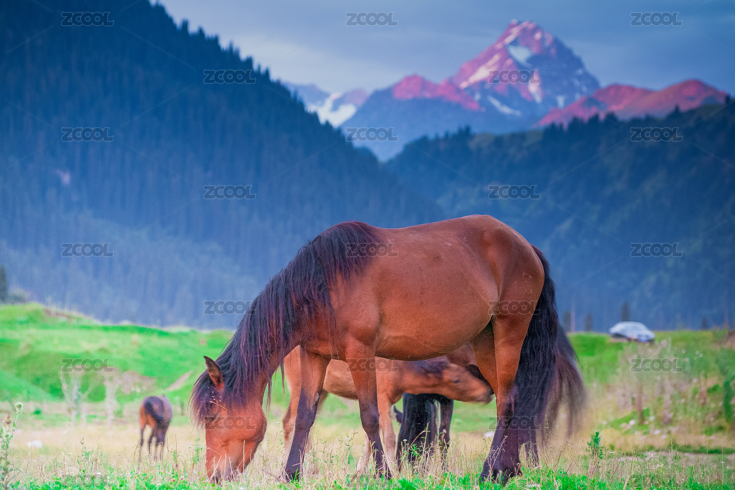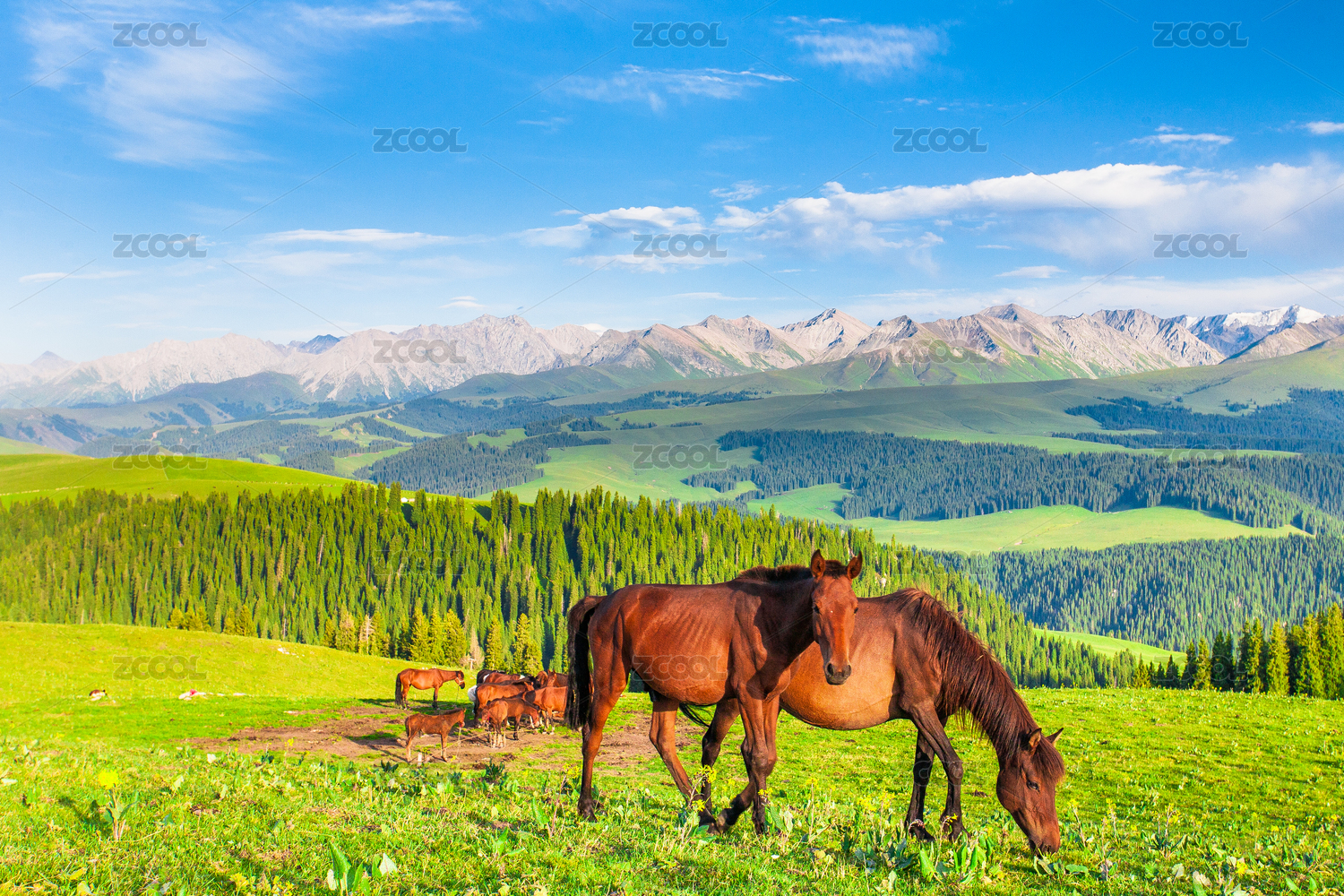 中国新疆伊犁库尔德宁草原高山草甸马吃草