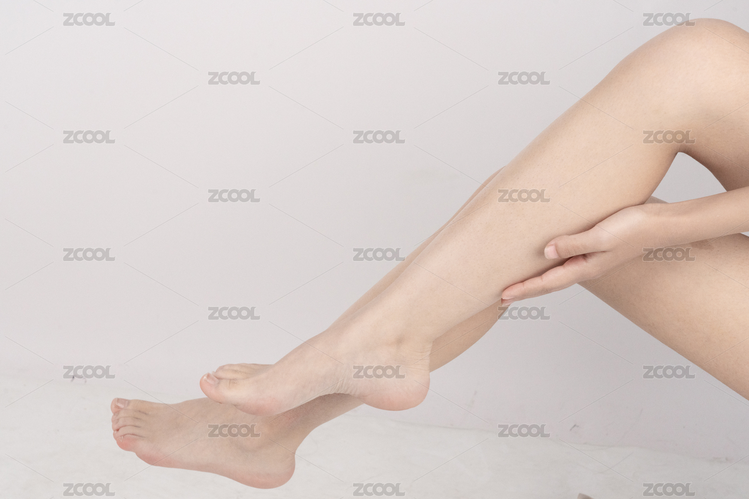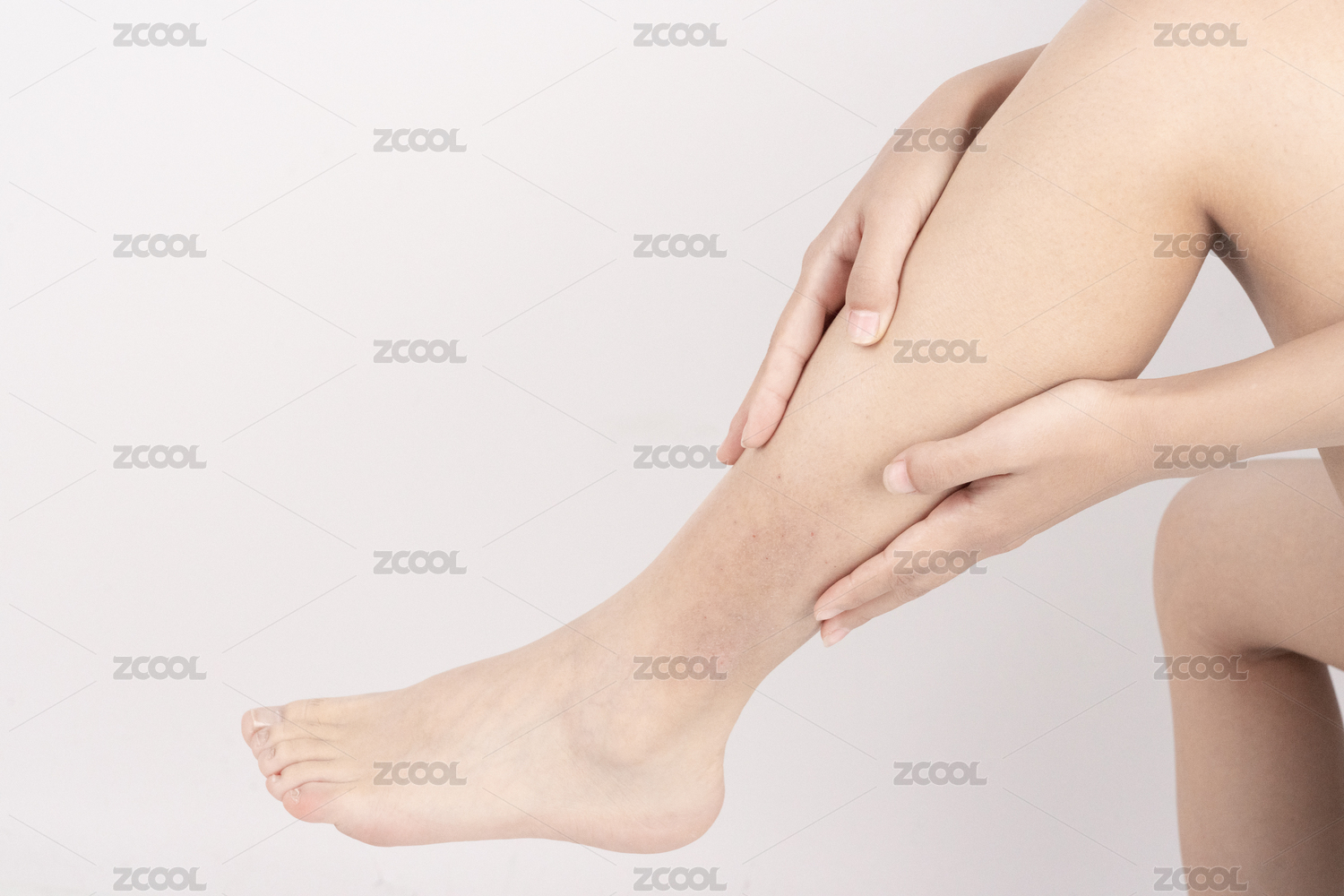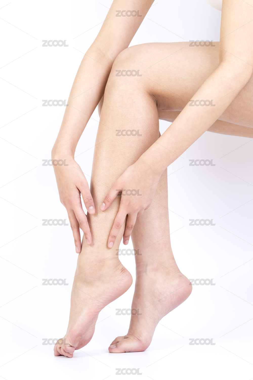 年轻美丽的女人在抚摸光滑细腻的腿部