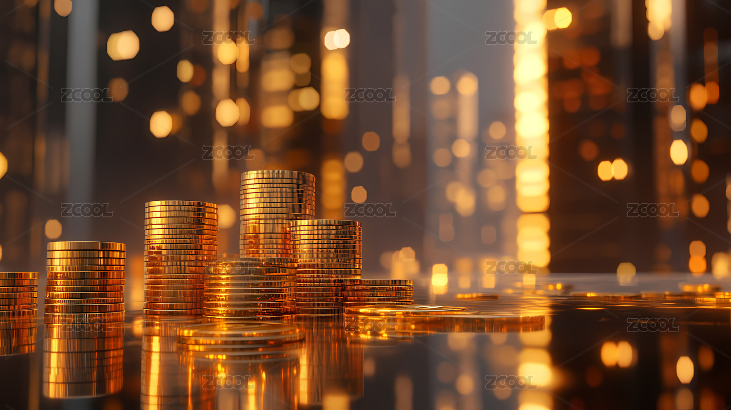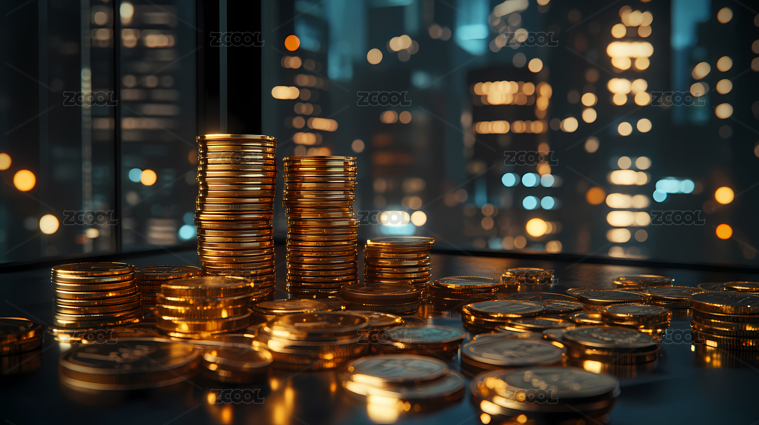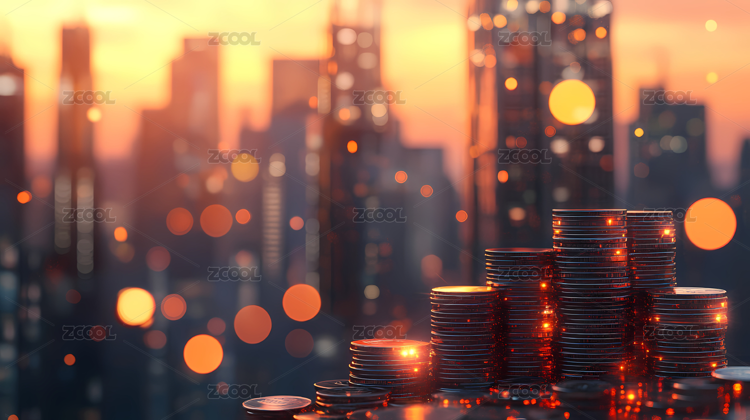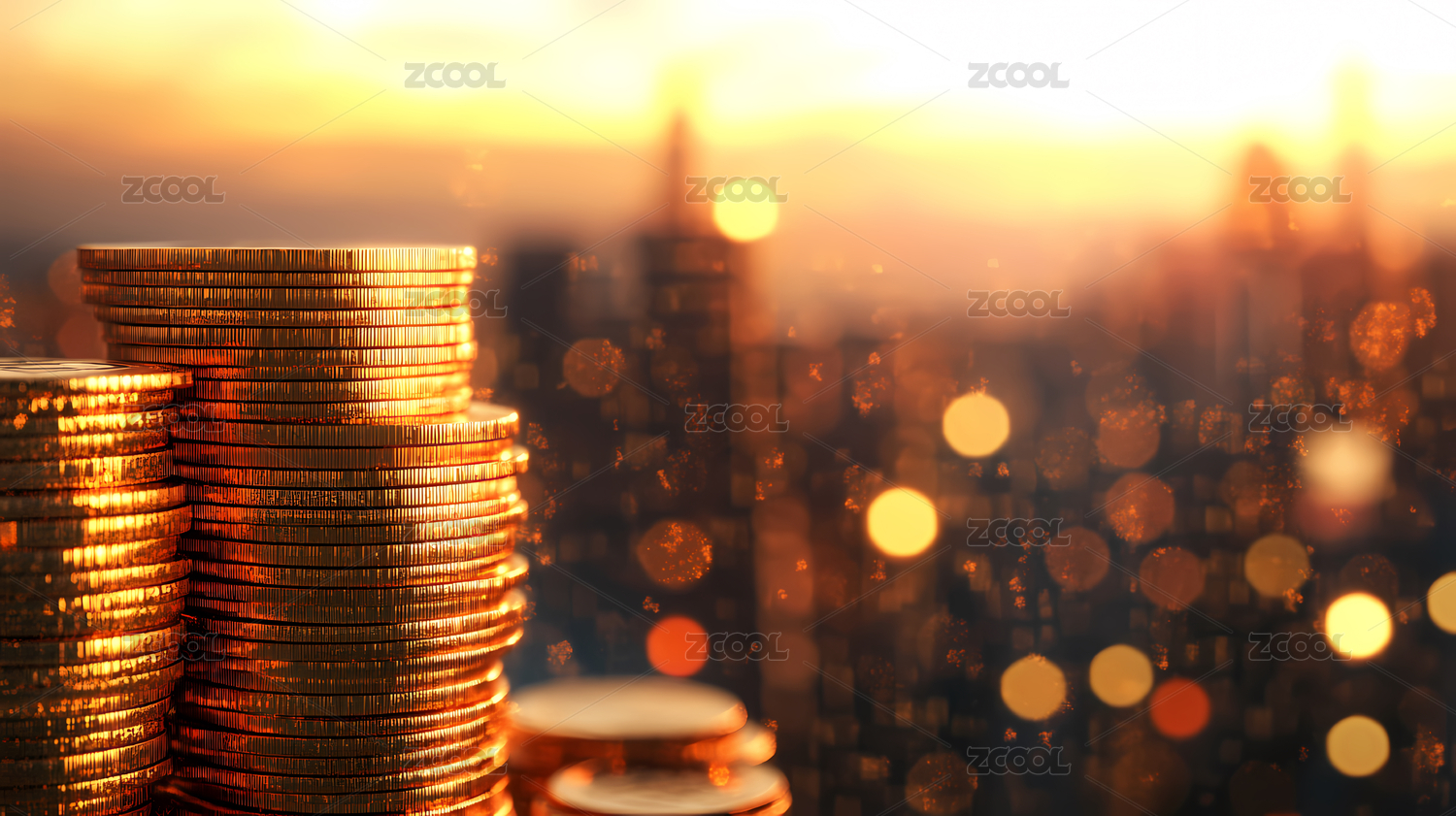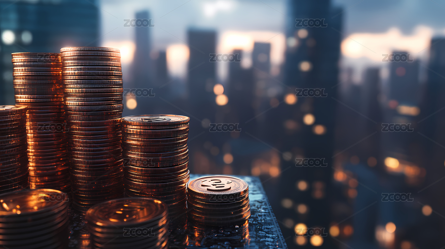 货币堆叠与城市天际线背景