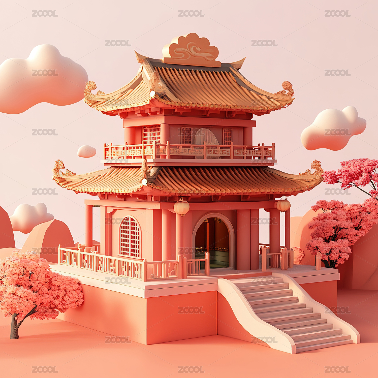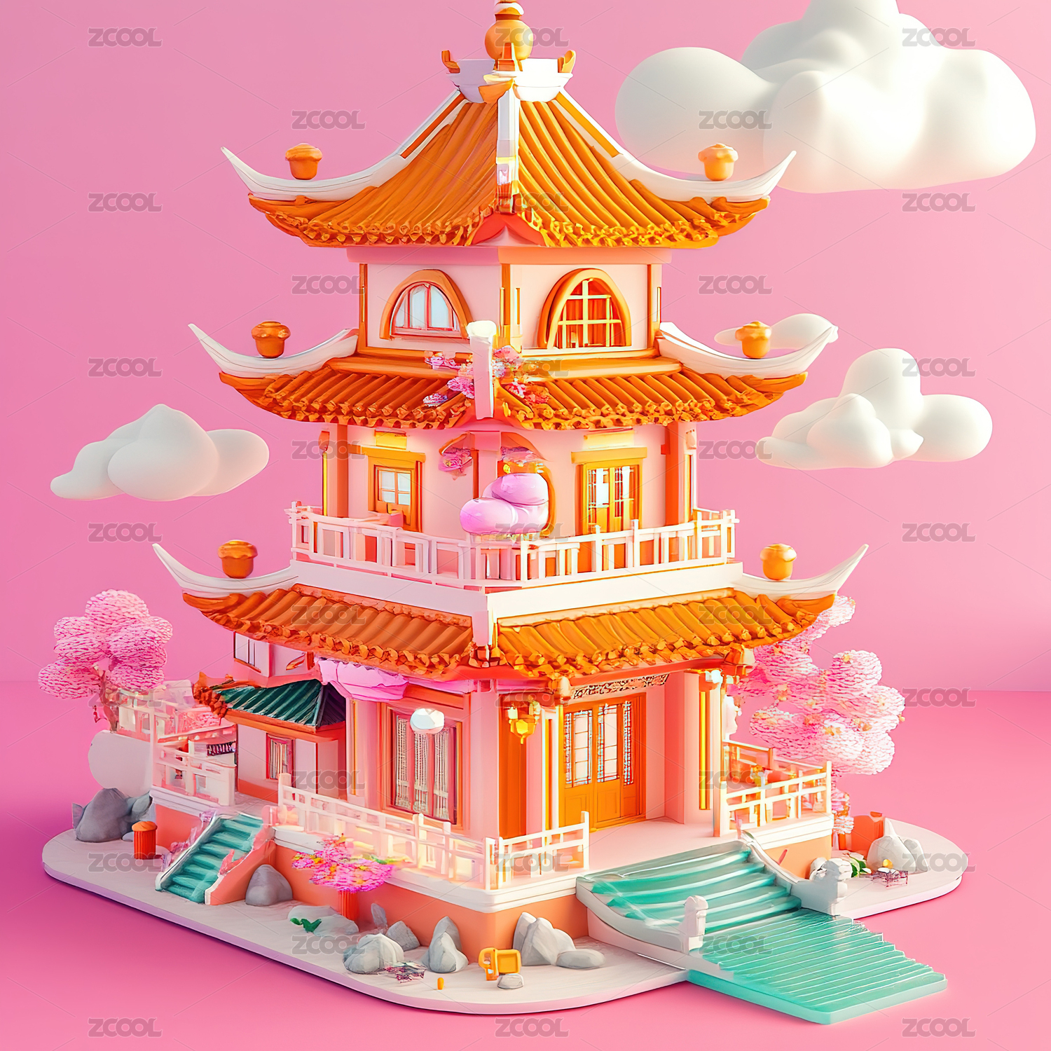 3D渲染的中国风古建筑插画,琉璃材质中式