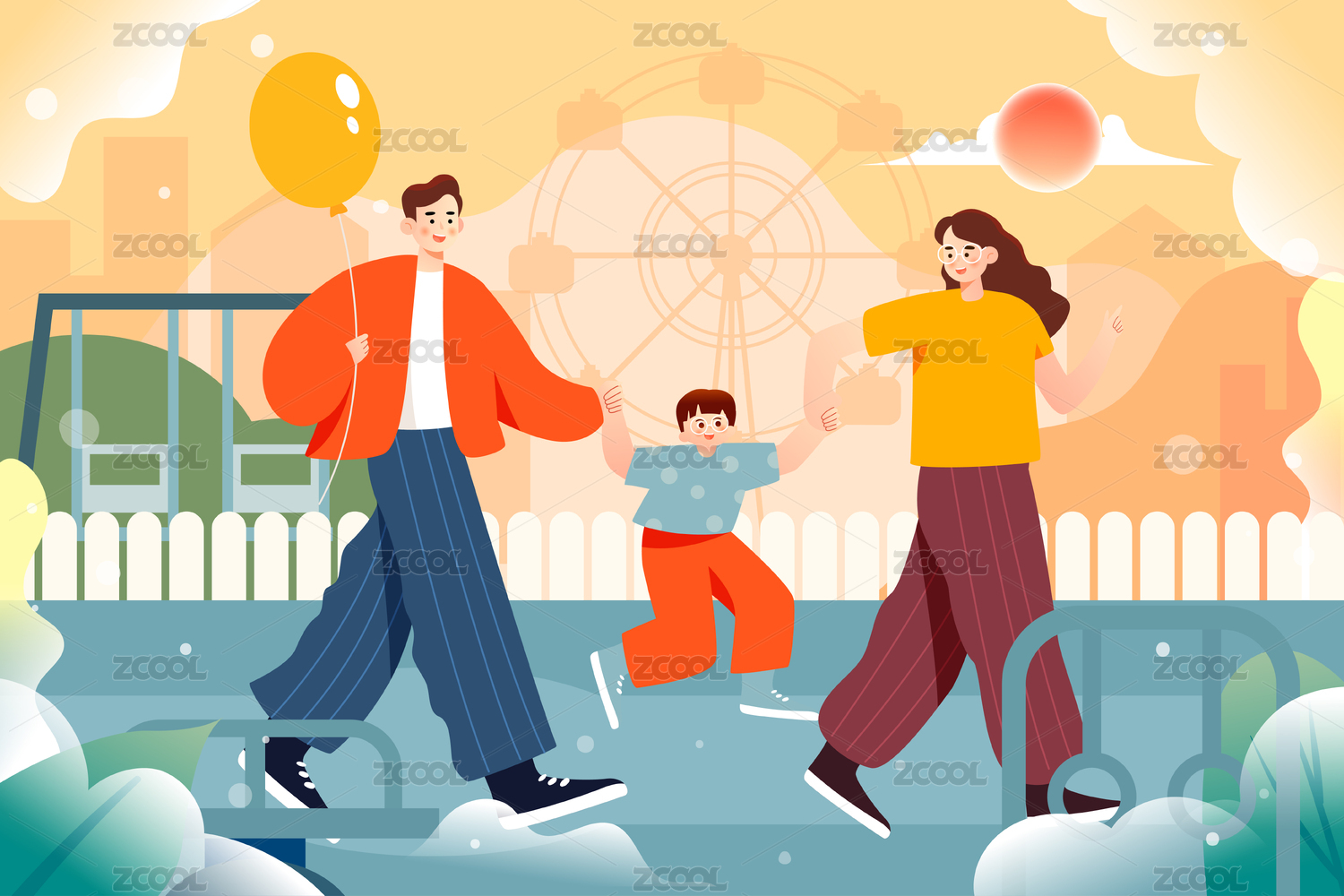 六一儿童节家人公园游玩户外游乐园玩耍插画