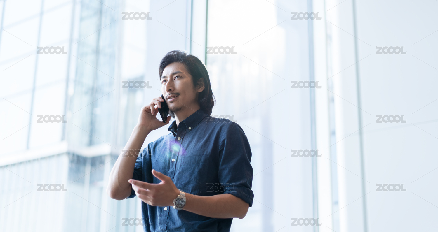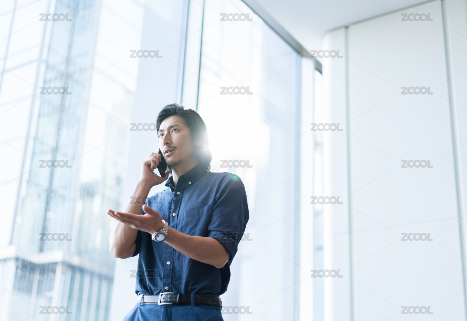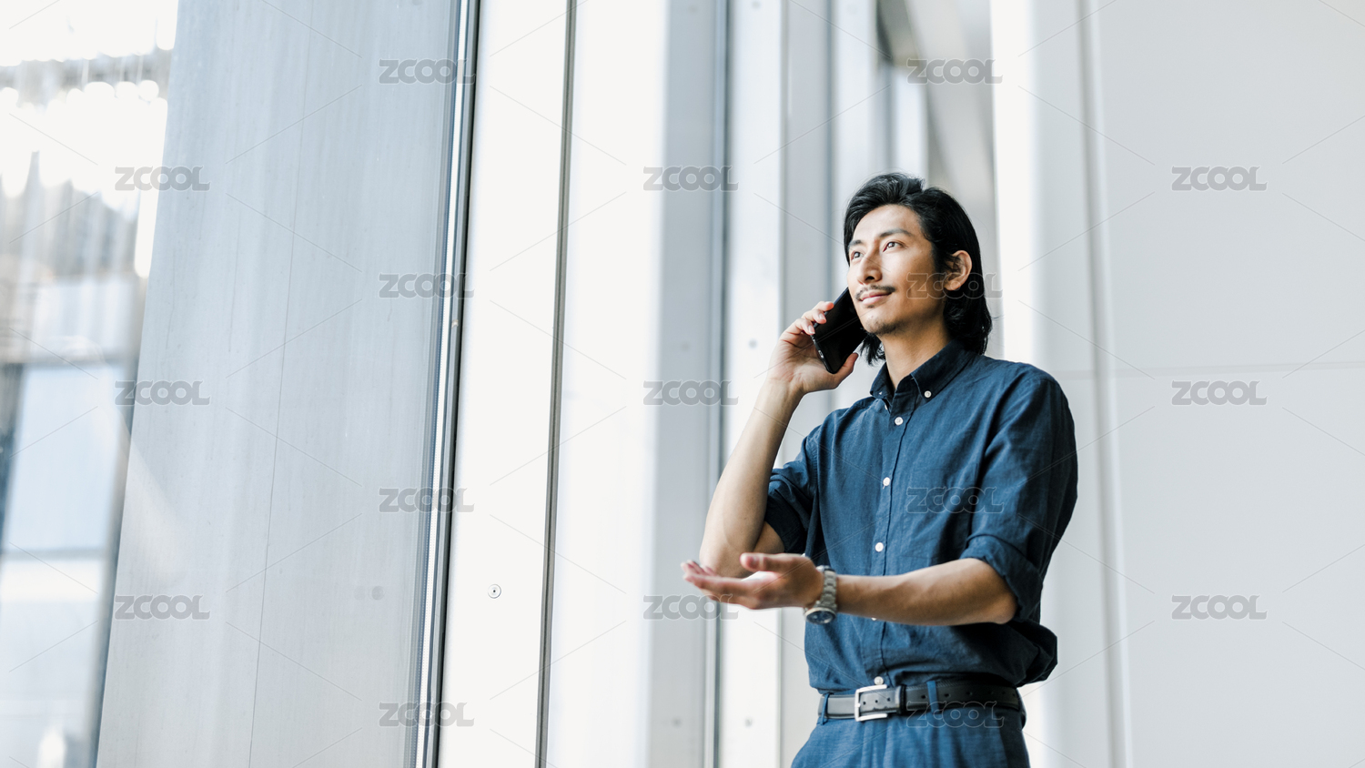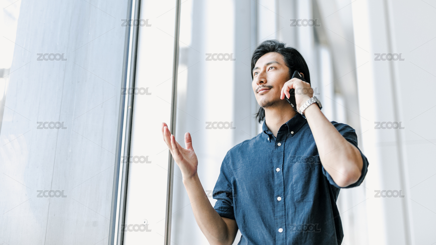 成熟的亚洲商务人士在写字楼的窗户边打电话
